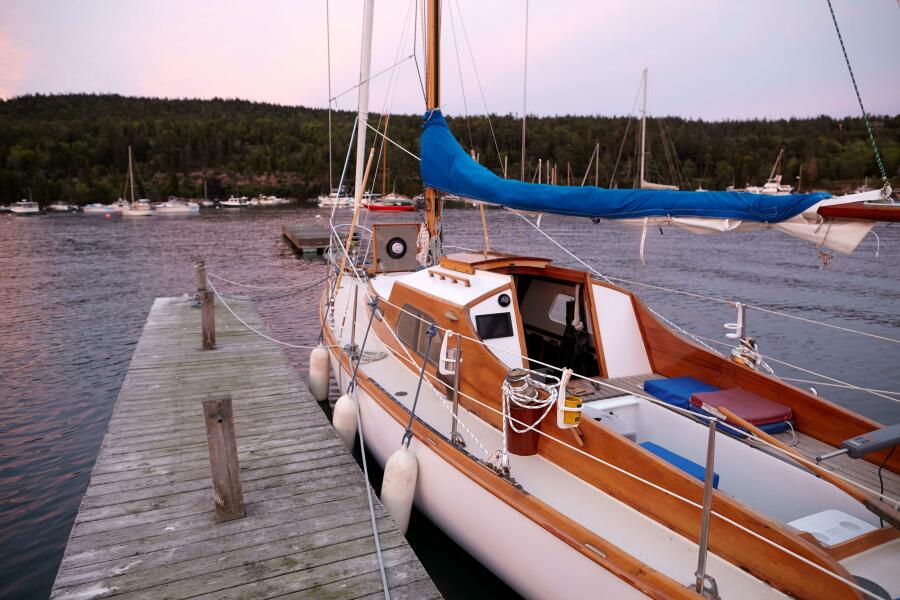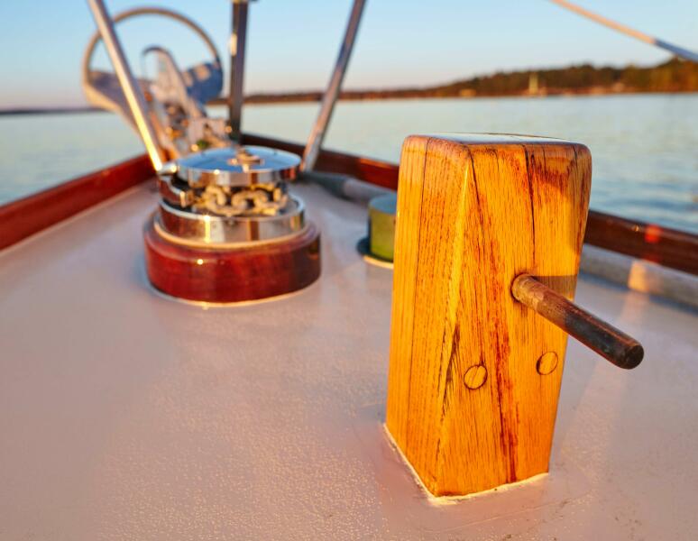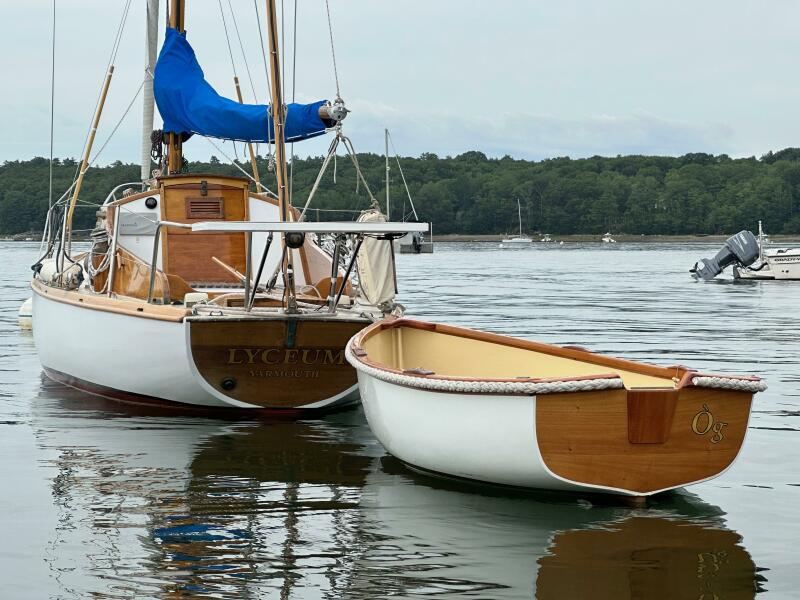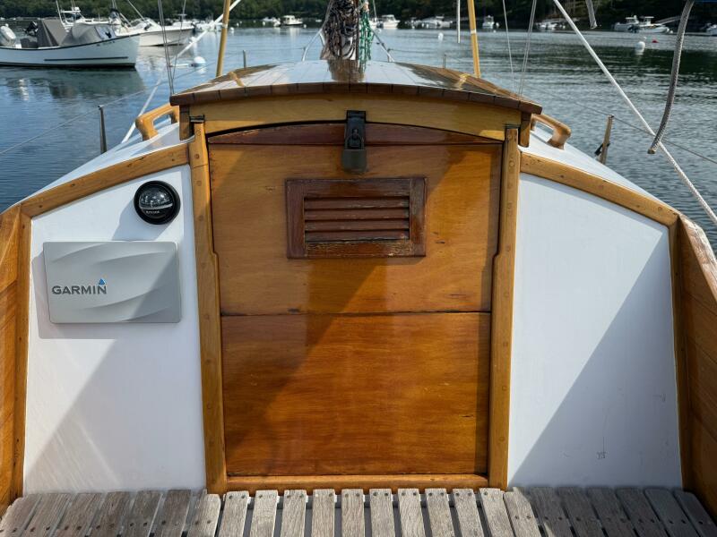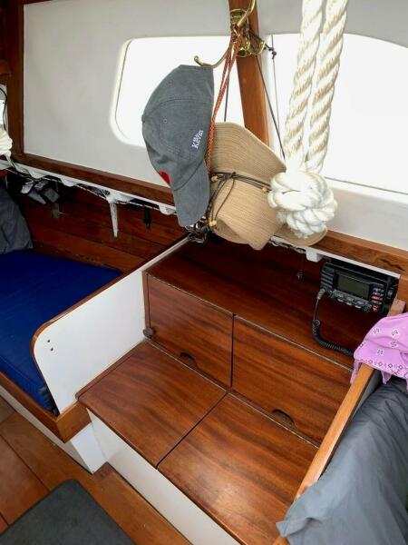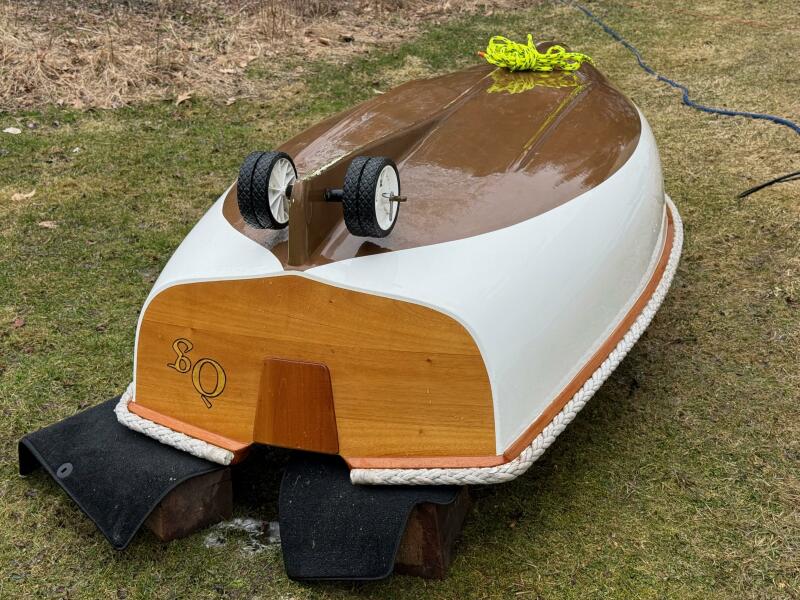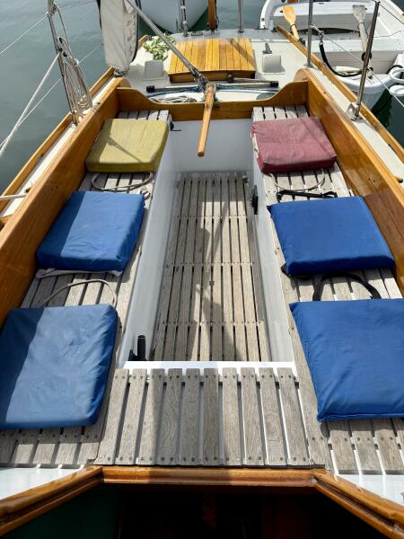 Stripped and revarnished exterior varnish (excepting transom and tiller)