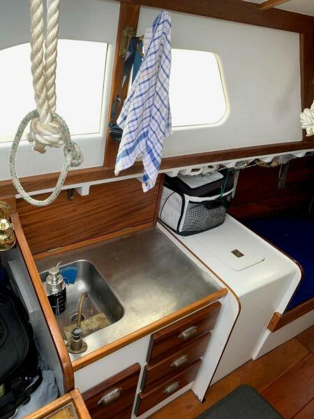 Galley rebuilt with drawers, tip out trash, flip down cutting board & built in ice box.