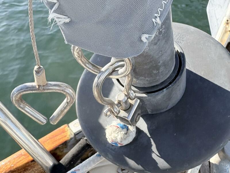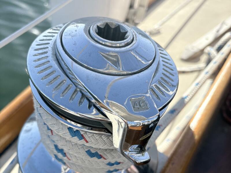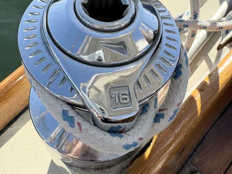 4 winches at the cockpit, two Lewmar 46 and 2 Lewmar 16s, provide easy handling of multiple sails. 2 winches, on the port and starboard side of the mast, manage halyards and topping lift. There is a rigid boom vang.