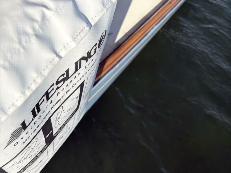 Aft in the cockpit there is a hot/cold pull-out shower, a Magma grill, and a stern ladder, and access to a manual bilge pump to supplement the 12 volt electric bilge pump. A Lifesling is present on the rail.