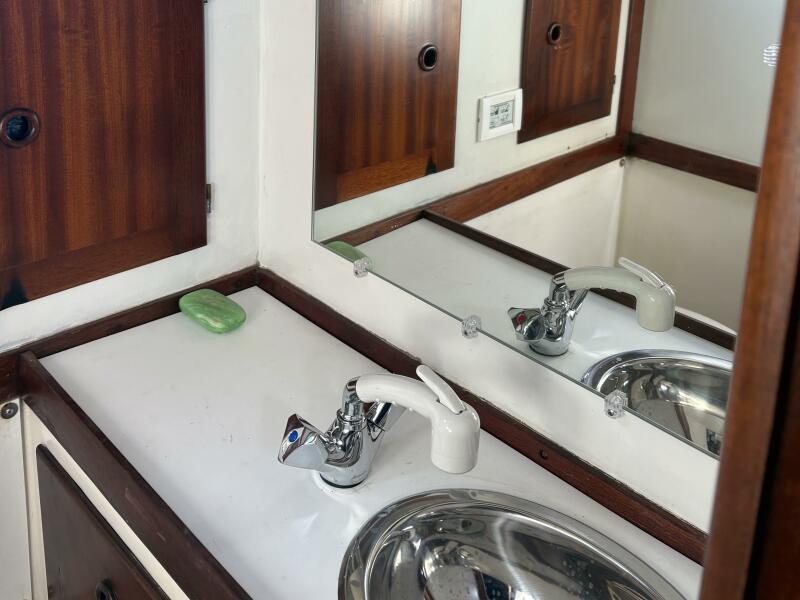 The head has a Rarian Elegance macerating electric head, and a sink with new pull-out faucet/shower. There is a 20 gallon holding tank. Hot and cold water are supplied by the water heater, heated by the engine or by the 12 volt system.