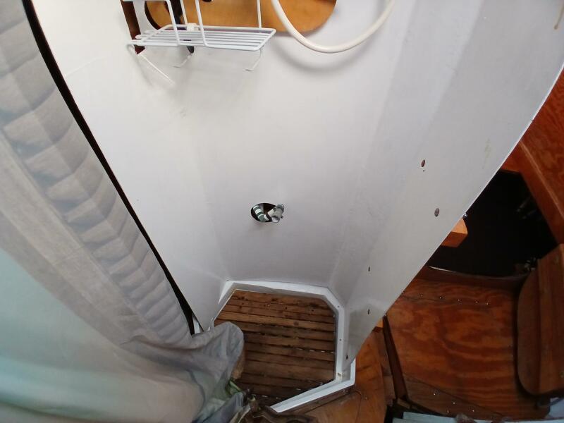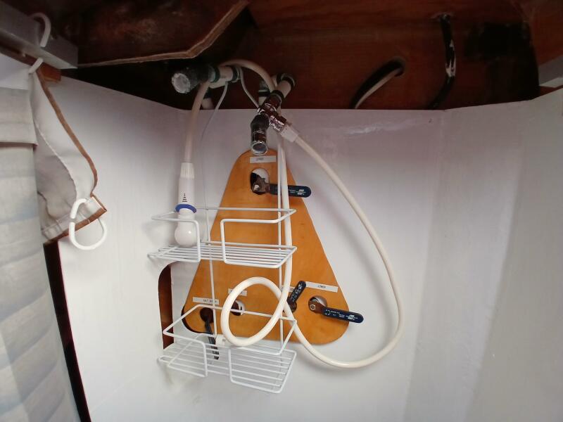 Gray water from shower basin, air conditioners and sinks in head are pumped by 1000 gpm pump to a 10 gallon grey water holding tank