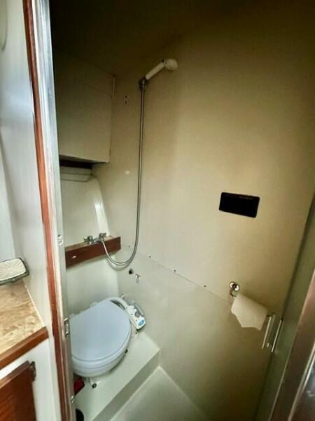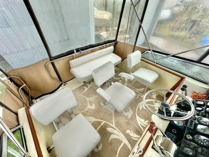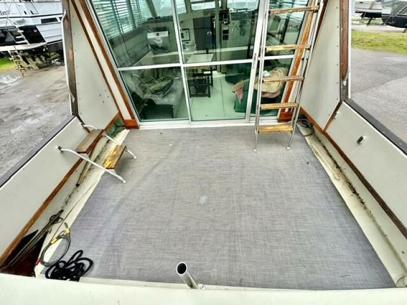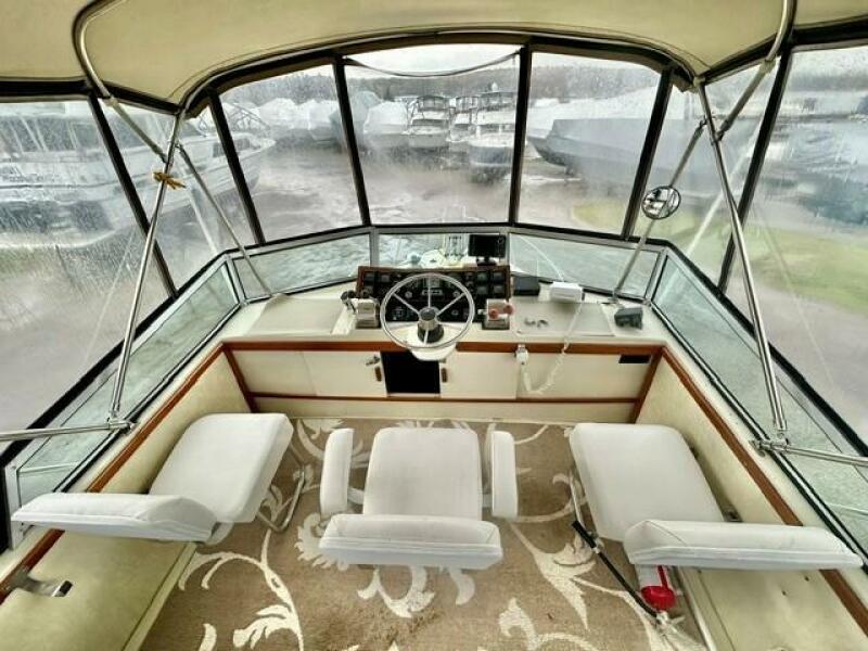 A popular model for Stamas, the 32 Sport Fisherman is a sturdy flybridge fishing boat with a roomy cockpit and practical cabin accommodations. She’s built on a solid fiberglass modified-V hull with moderate beam, and a well-flared bow makes for a dry ride in a chop. With the lower helm open to the cockpit, the layout of this boat is ideal for anglers (although a sliding glass bulkhead enclosure was optional). A dinette opposite the helm is a convenient place to get out of the sun, and down below there’s a small galley to port and a head with a sink and shower opposite. Lockers separate this space from the forward stateroom with its long V-berth. The cockpit is large enough to accommodate a full-size fighting chair, and the side decks are about as wide as you’ll ever see on a boat this size. Topside, the bridge controls are well aft affording a clear view of the cockpit. Additional features include a vented windshield, bridge seating for three, and good engine access. Several engine options were offered over the years. Among the most popular, a pair of 260hp gas inboards cruise the Stamas 32 at 18 knots (about 27 knots top), and larger 330hp gas engines cruise in the low 20s and top out at 30+ knots.