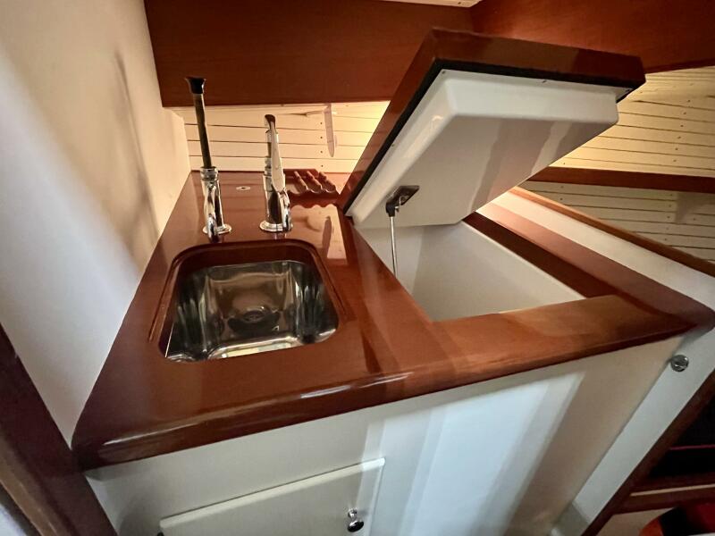 The consideration, adjudication and execution of EVERY detail can be seen throughout. From the ice box lid stainless steel gas strut, to the interior hull ceiling and overhead Herreshoff-style white planks, to the napping-child-gate, to the refurbished compass...the detailed approach is without comparison.