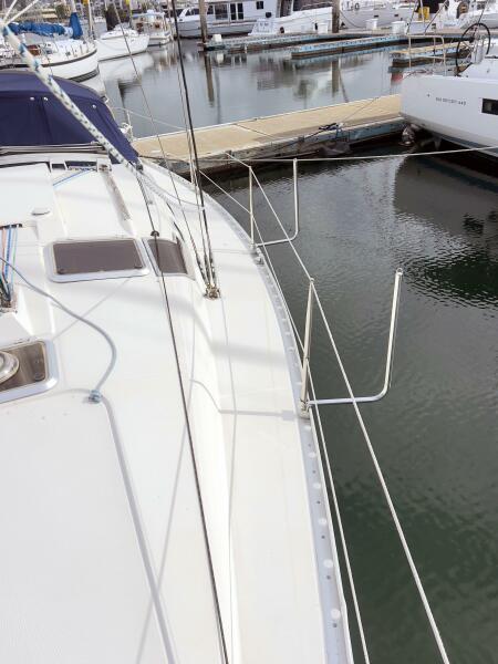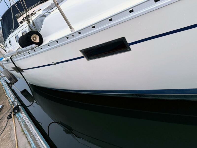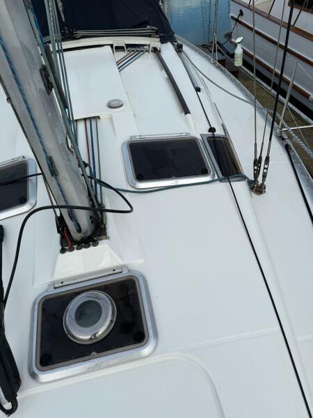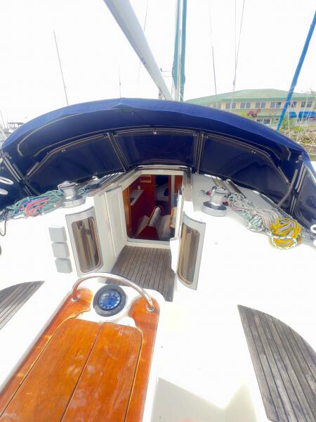 The interior is bright and thoughtfully arranged, providing privacy and comfort for extended stays with family or guests.On deck, you’ll find a roomy walk-around cockpit with a brand-new dodger, a convenient walk-through swim platform, a built-in fiberglass table with integrated cooler, and large cockpit lazarettes for ample storage.