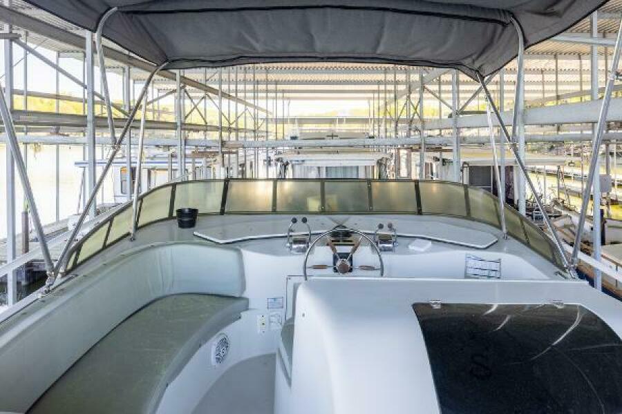 Dual station with expansive flybridge for open air with plenty of room for guests to mingle. Lower station in salon with great views and climate controlled area. Both stations have gauges and controls for control of the boat from each helm area.