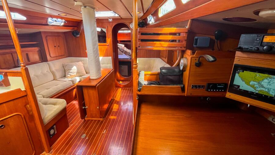 Owner’s Stateroom Aft: Large double berth (new mattress 2022), settee, desk, storage, private companionway to deck (new acrylic washboard 2022).