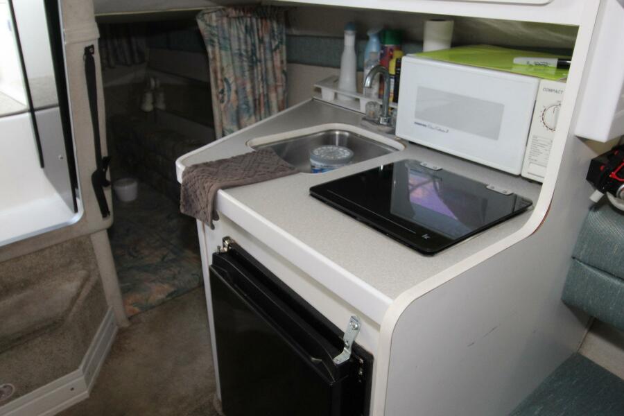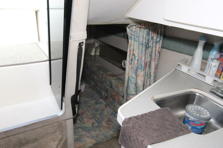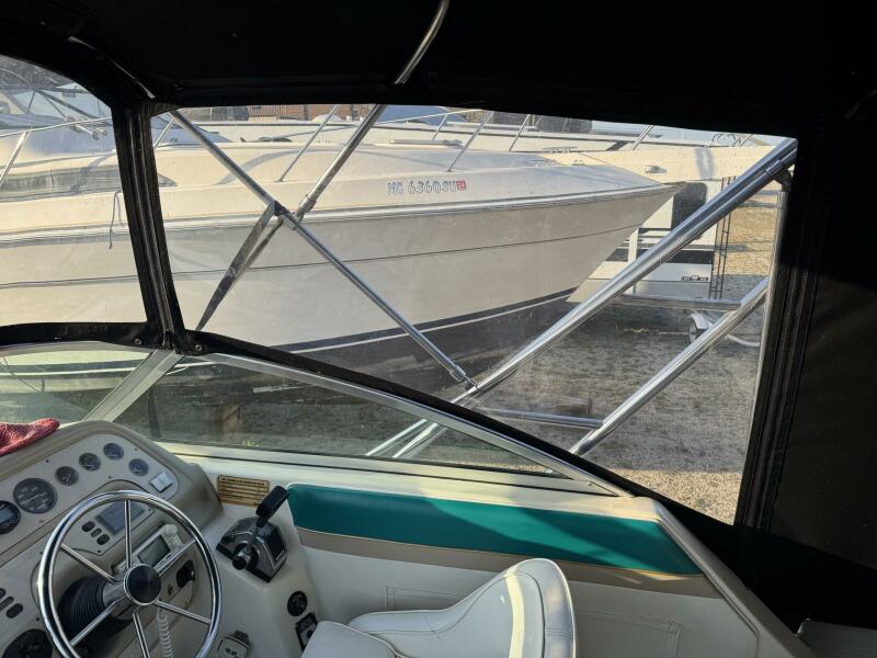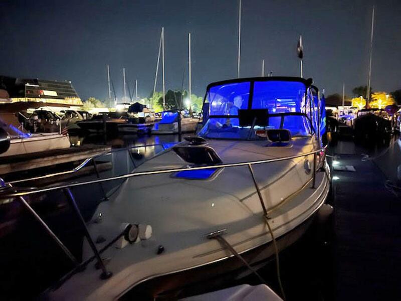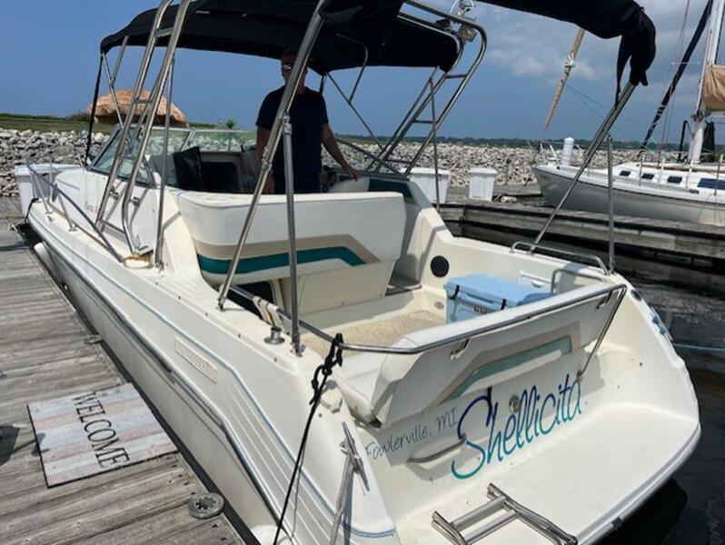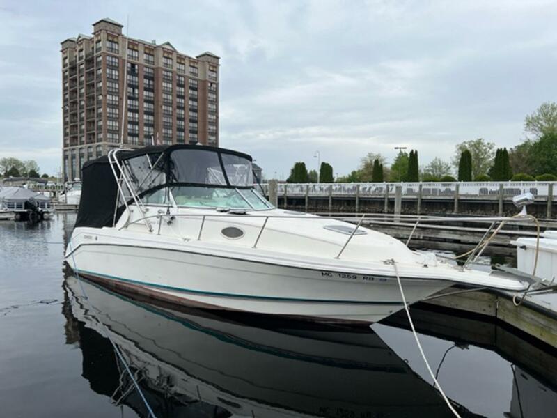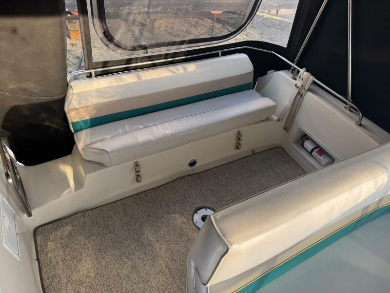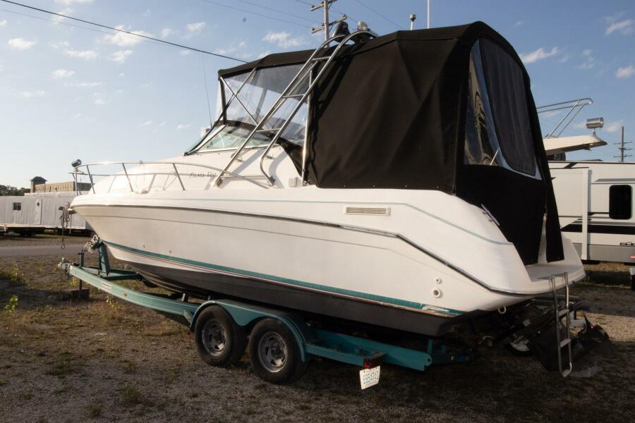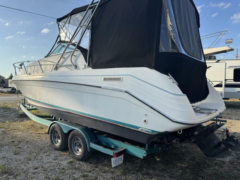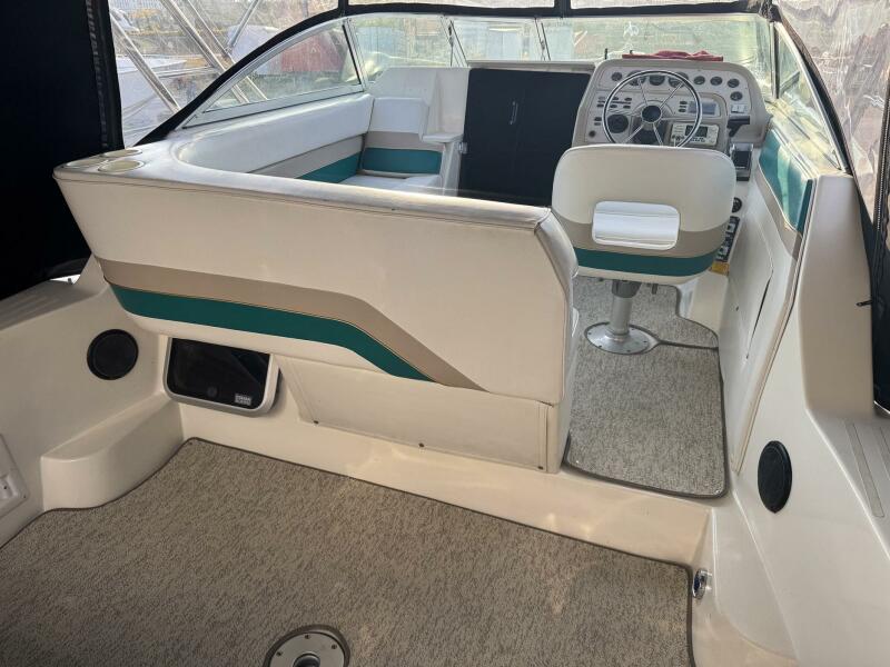 Built in 1995, this vessel is 28.92 feet in length overall. A used Rinker 265 Fiesta Vee built in 1995 is perfect for overnight cruising and day cruising. Extremely clean. 5.7L Mercruiser 260 HP with Bravo 2 Outdrive, 3 blade Prop, Trailmaster Trailer with new tires, new Full Camper Enclosure with very clear Isinglass. Dockside Power, Stand Up Head, Galley with Sink and Microwave, Trim Tabs, Battery Charger, Snap in Cockpit Carpeting. The boat has a Humminbird Helix 5 for charts and depth, also new Belva BMS654BT 1000W Peak 4-Channel Bluetooth Amplifier with 4 6.5" 2-way coaxial marine speakers. Recent improvements include new bellows, Gimbal bearing, carpet, canvas with Isinglass and refrigerator. The deck lighting is LED (blue). Must see this boat to believe!