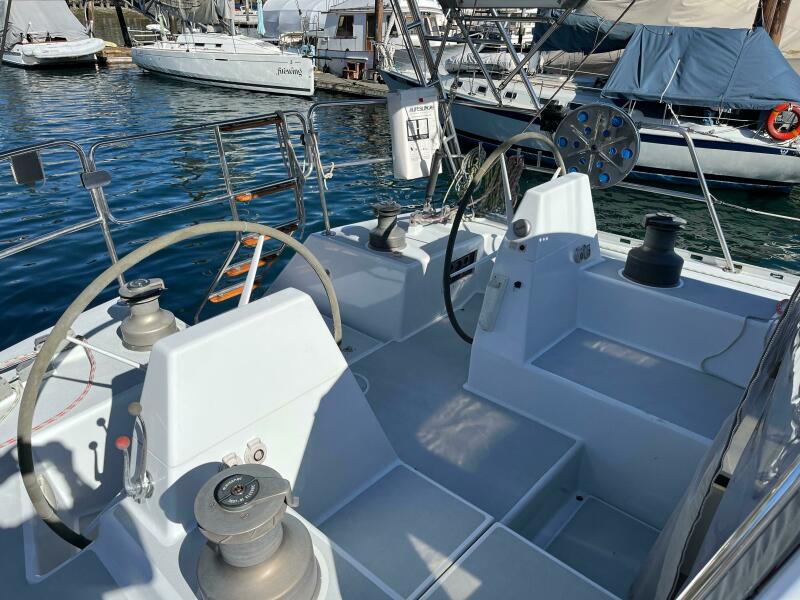 (2) Meisner 32ST-60 E electric mainsheet winches aft of twin helm stations, one is set up to furl Harken headsail furler, they also are used to raise and lower dinghy or outboard.