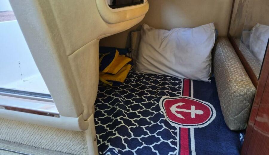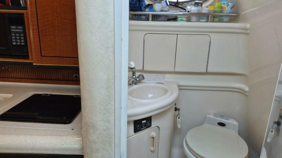 Built on a deep V hull with a moderate beam and an integrated swim platform, the Sundancer's curved radar arch is an appealing design touch that's showing up on a good many express boats these days.The single level cockpit is arranged with a sun pad opposite the helm, an aft facing bench seat, wet bar,and a retractable rear bench seat that folds up into the transom when it's necessary to get into the engine compartment. A large storage locker is built into the transom,and molded steps at the helm provides easy access to the Walk through windshield.