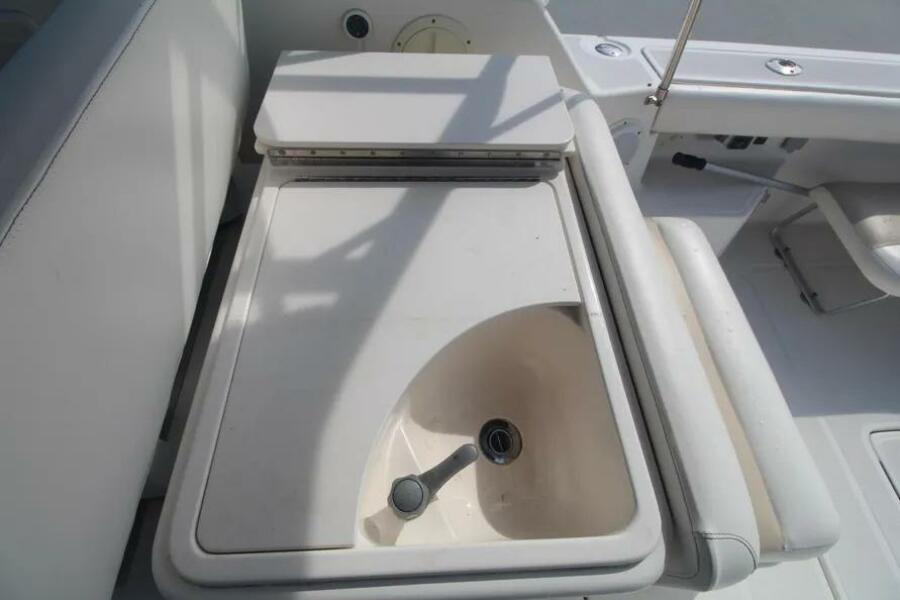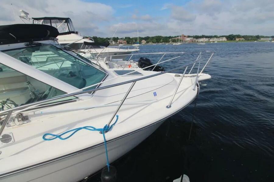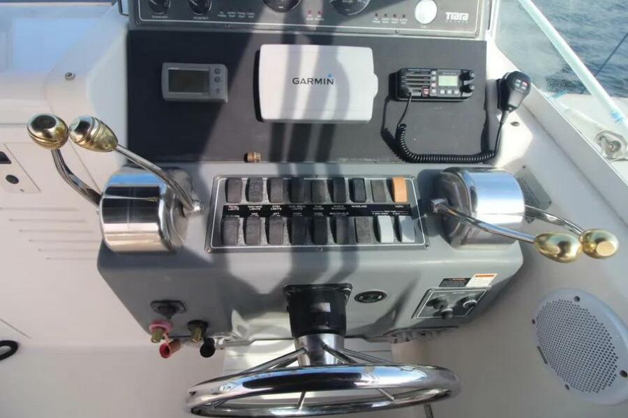 The 2900 Coronet is an attractively priced sport cruiser with a great deal of versatility, unique styling with a huge cockpit plus a unique curved reverse transom. She's constructed on a modified-V hull with a wide beam and a substantial 19 degrees of transom deadrise. By design, the Coronet's emphasis is on open-air enjoyment and her large single-level cockpit will seat eight in comfort. The engines are under the two seat boxes, and the entire forward section of the deck can be electrically raised for access to the motors. Aside from the generous seating arrangements, the cockpit is equipped with a wet bar aft of the helm seat as well as coaming bolsters and a centerline transom door. The high windshield is notable, not just for it's sturdy construction, but for the reverse-angled spray guard along the top. Below decks, the Coronet's interior provides berths for two with an enclosed head, mini-galley, and a teak-and-holly cabin sole. Keeping with the Tiara fleet she retains the superb fit and finish seen in all Tiara models.