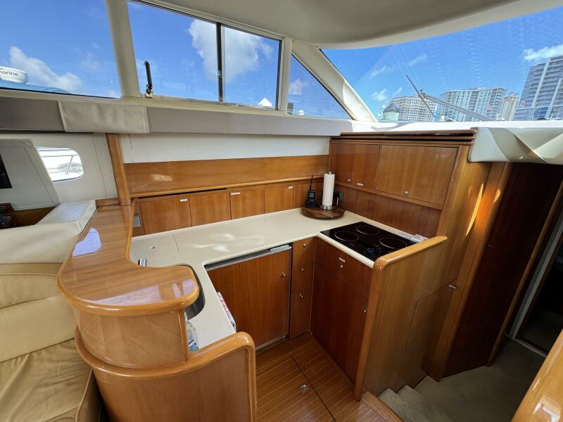 The Viking Princess 45 Flybridge combines sleek styling with impressive performance on the open seas. The well-appointed two-stateroom layout features a luxurious, high gloss cherry finish, and cabinetry storage. The master head is spacious as is the guest head. Both have large, stand-up showers. The salon area features a neutral-toned theme. It includes ultra-leather fabrics, high-gloss Vitacore cherry wood, a roomy U-shaped dinette w/table, and built-in settee. The 45 Flybridge has a full helm on the bridge and a lower helm in the comfort for all weather conditions! Her galley is modern with ample countertops and storage. The engine room features twin Volvo Penta TAMD 74P diesel engines and ZF Marine transmissions.