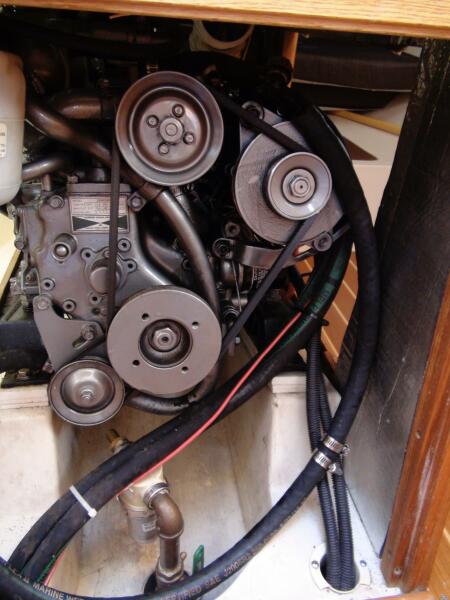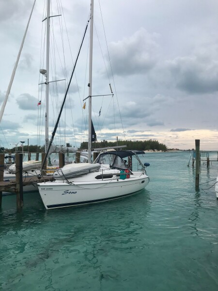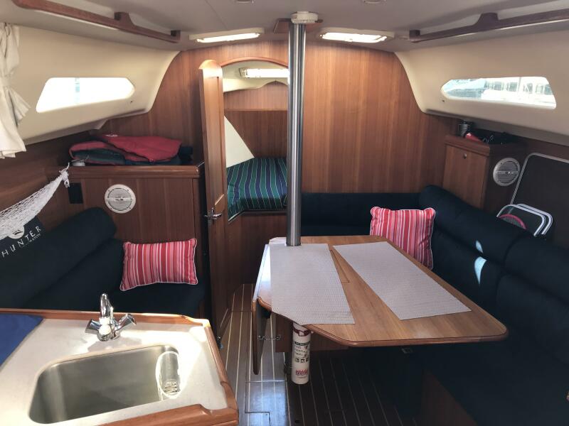 The interior includes a spacious salon, two private staterooms, a full-size galley, and a dedicated navigation station. She is designed for comfort with ample headroom and natural light from multiple hatches. The boat can comfortably accommodate a small family or group, making it suitable for weekend cruising or day sailing.