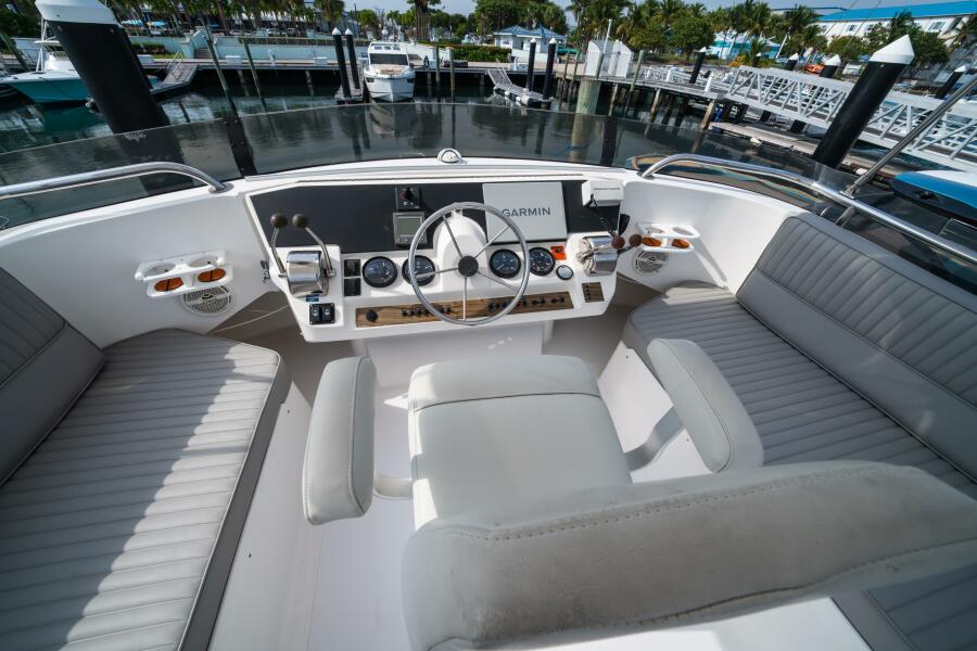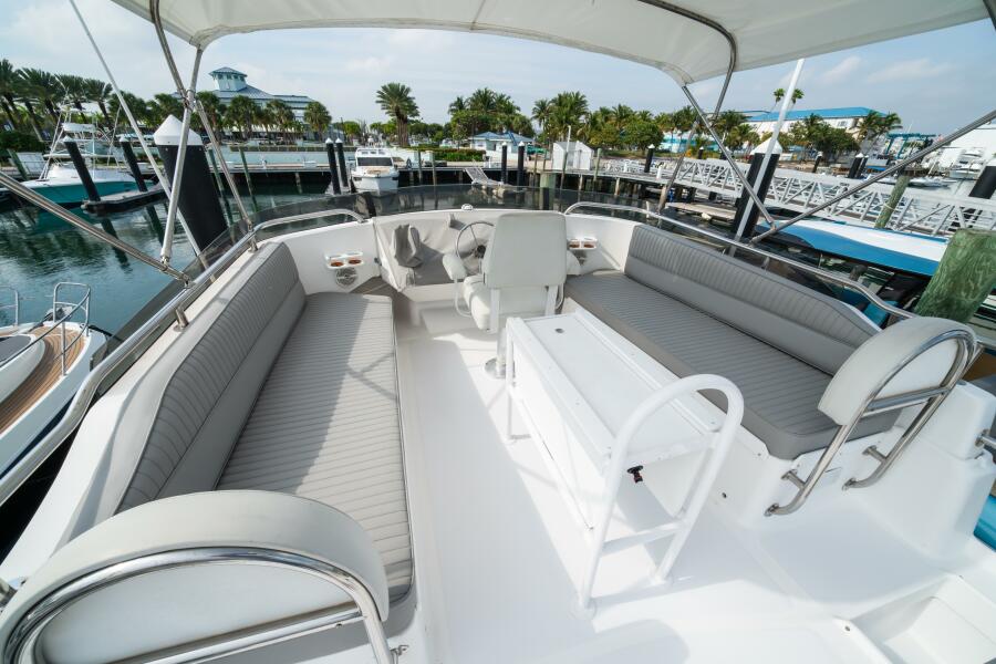 The flybridge is expansive and open, offering excellent 360° visibility. A forward centerline helm is complemented by a captain’s chair and guest seating to port and starboard. Aft, the open sundeck provides ample space to relax and enjoy the ride. A starboard-side stairway leads down to a covered cockpit with transom door and swim platform, while sliding glass doors offer easy access into the salon. Fresh bottom paint and striking blue hull accents enhance her overall appearance.