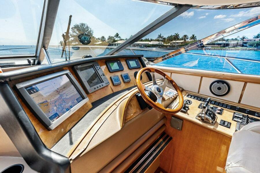 Step through the double sliding glass doors and enter the upper lounge area with an entertainment system, a large couch with a coffee table, and plenty of storage. Forward and to starboard is the helm station with a double helm seat and a full array of Raymarine electronics to guide you safely to your destination.