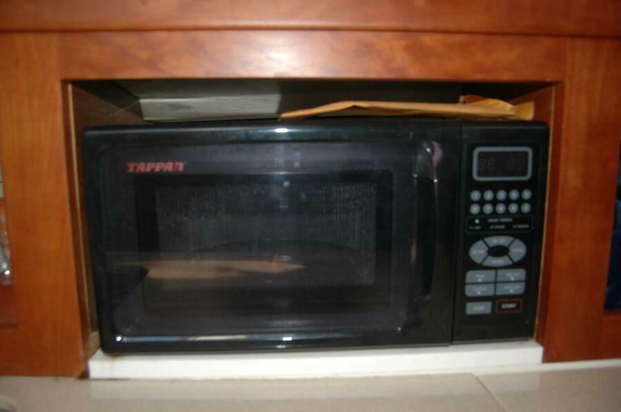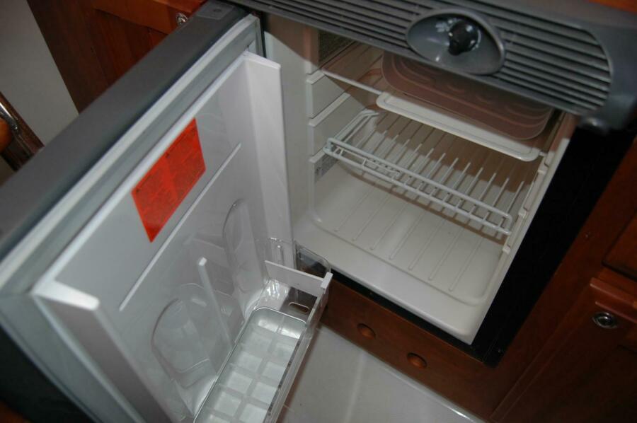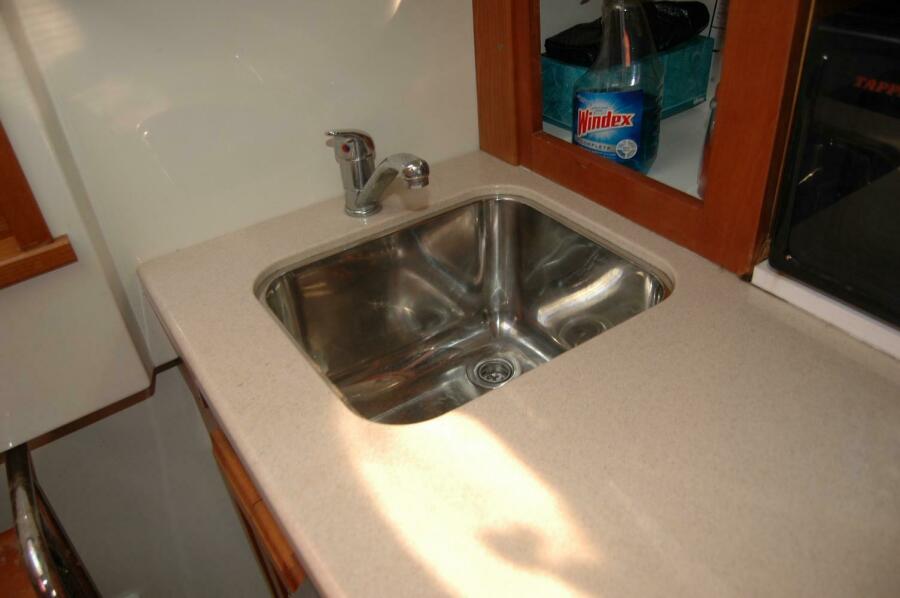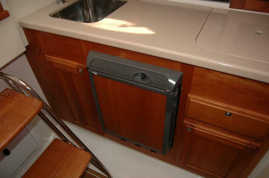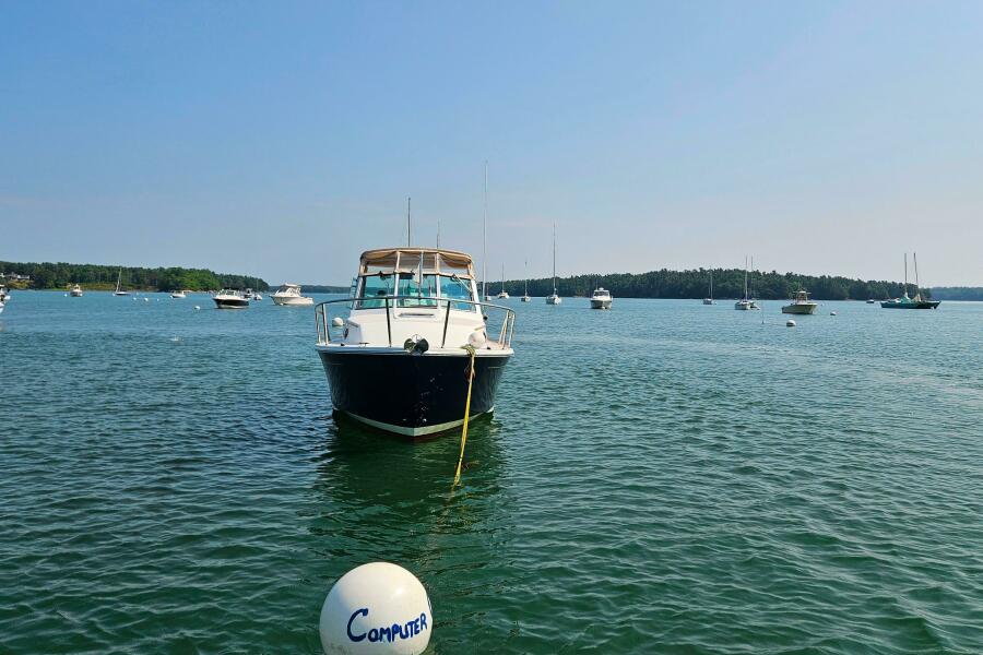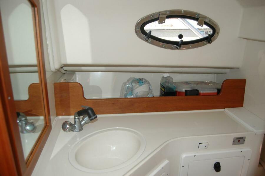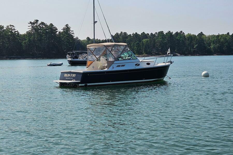 Below deck, it features a cherry-wood interior with a convertible dinette that sleeps two, a compact galley, and an enclosed head with a shower.