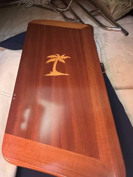 TOMMY BAHAMA, LIMITED EDITION – Bamboo colored hull, Tommy Bahama upholstery, Corian counter tops, Salon table with TB Palm Tree inlay.