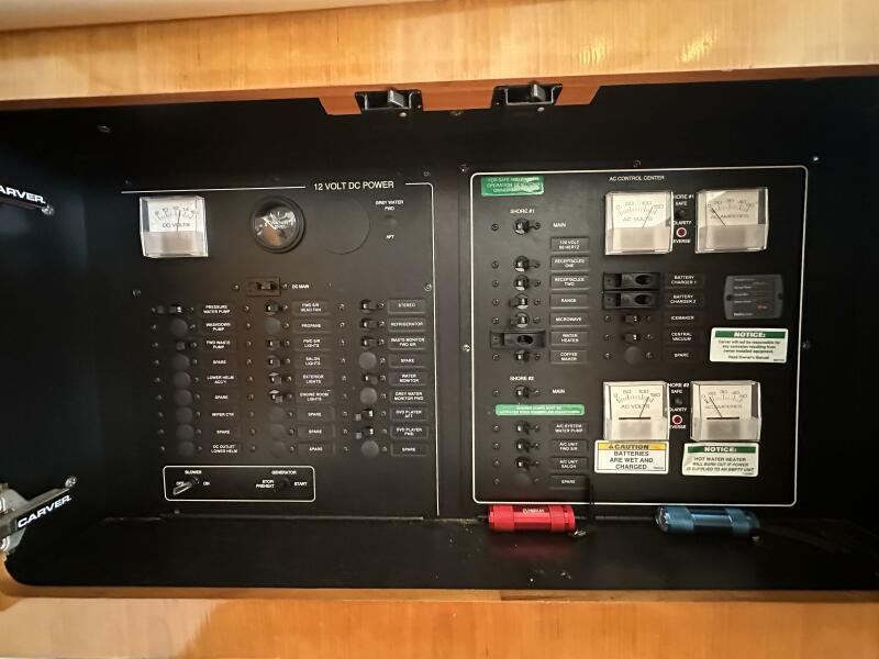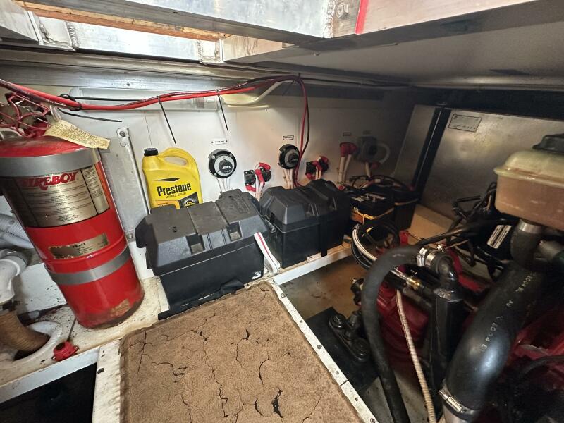 Mechanical Systems: Features an automatic Fireboy fire suppression system, Dometic/MarinAire reverse-cycle AC/heat (dual zone), and a Reverso oil change system for easy maintenance.