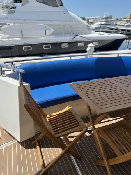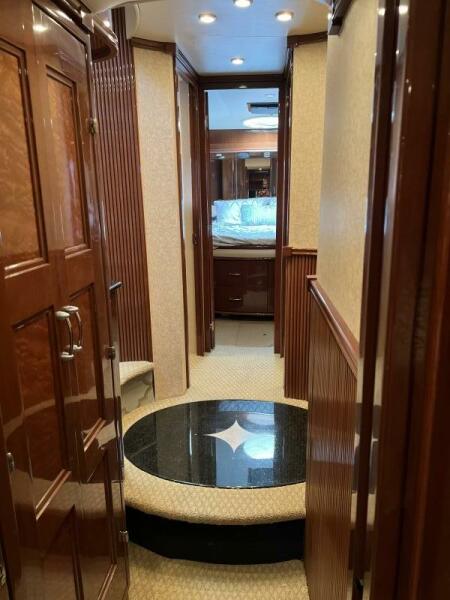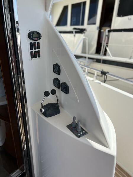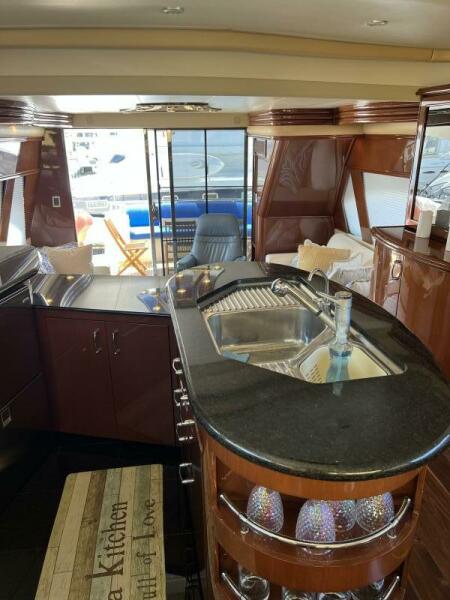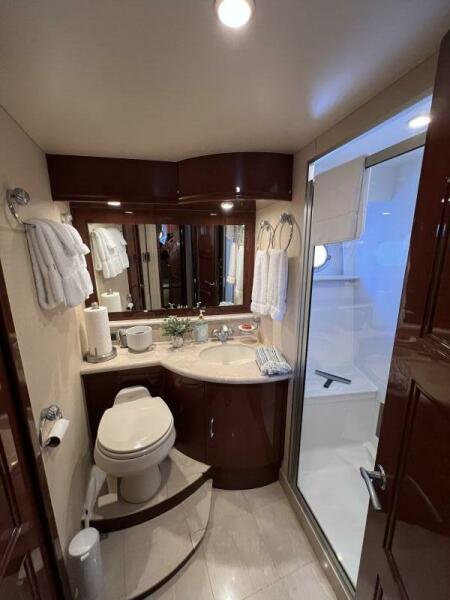 Interior: Stepping inside, you are welcomed by a bright, open salon with expansive windows, designer furnishings, and plush carpeting. The galley is positioned forward, featuring full-size appliances, granite countertops, and an adjacent dining settee. Below deck, the accommodations include a full-beam master suite with a walkaround berth, abundant storage, and a luxurious private head with full size tub. The VIP stateroom forward and twin guest stateroom amidships share a second large head. Separate crew quarters with private access offer added flexibility.