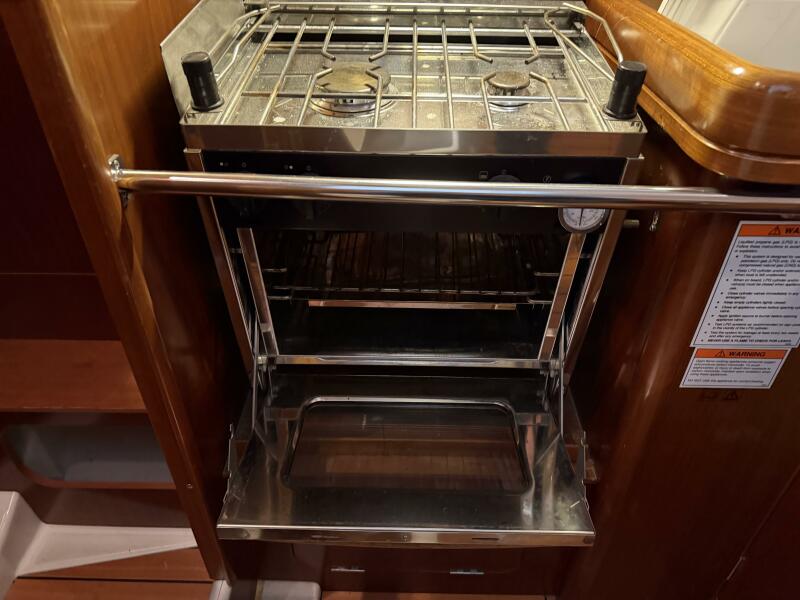 · Gimballed stainless steel 2-burner stove top with oven and stainless steel safety rail also serving as handrail.