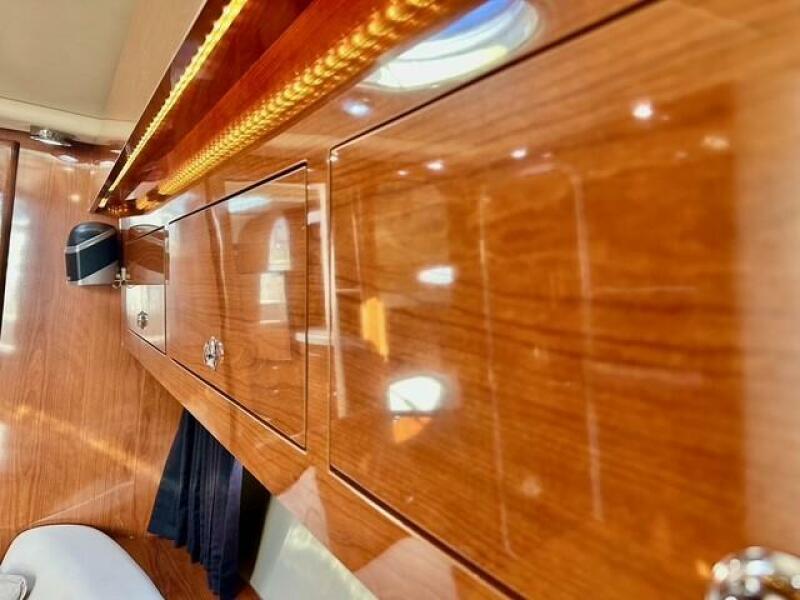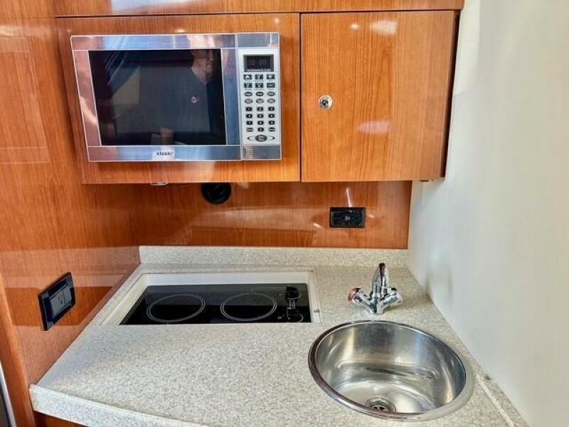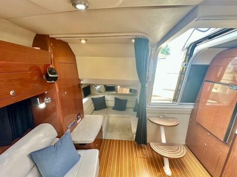 With a beautiful blue hull, synthetic decking externally, along with the cockpit wetbar, large convertible aft sunlounger, and high gloss joinery in the interior, it’s a very stylish looking boat that will be a pleasure to your spend time on.
