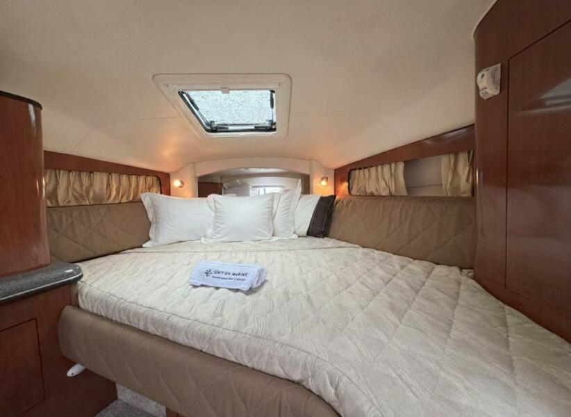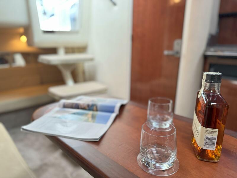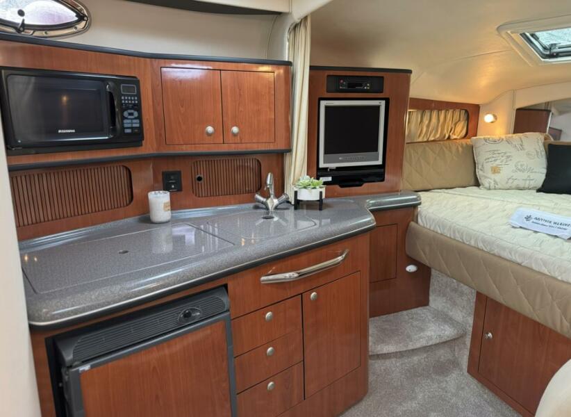 When you step aboard the vessel shows very well, the interior cabin space, shows the updated 2006 version with the inviting salon giving space for relaxation and socialization with friends and family. The galley boats abundant counter space and storage solutions normally seen in a vessel larger than this.