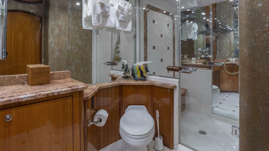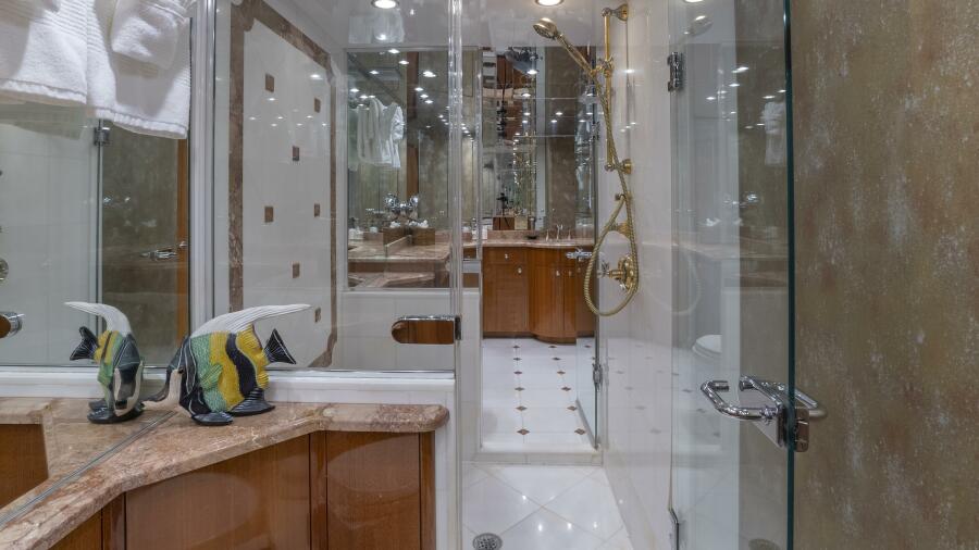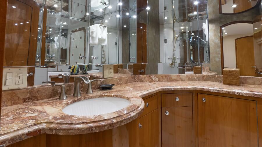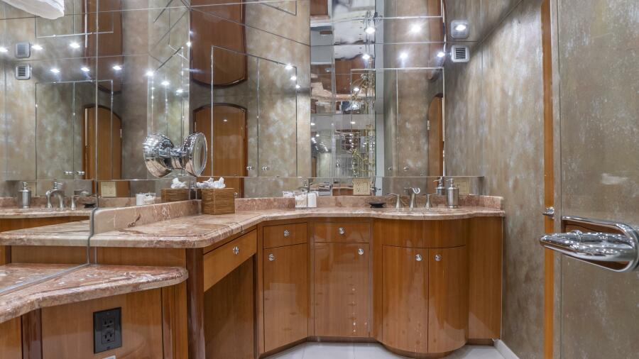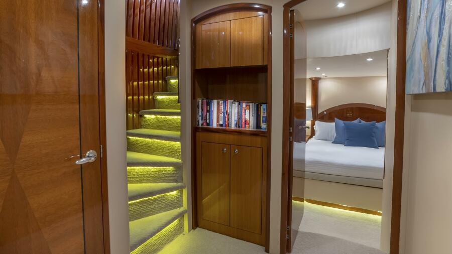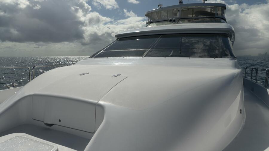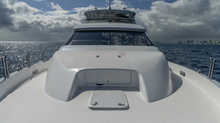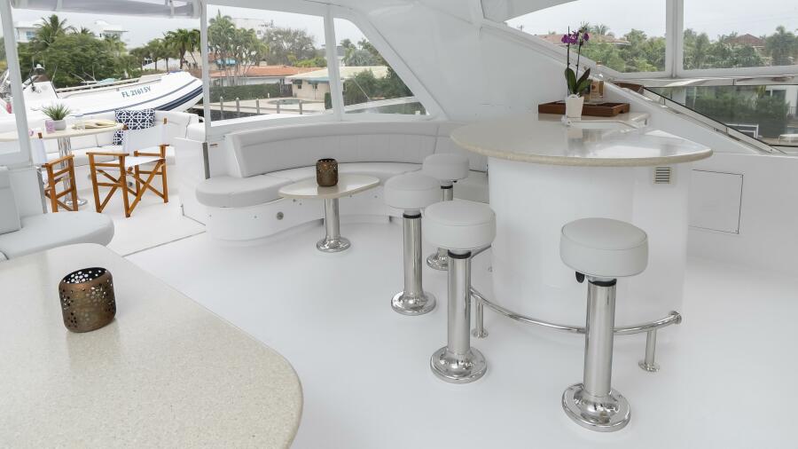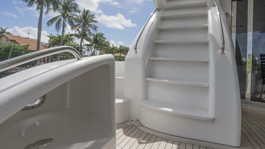 Her spacious flybridge offers panoramic views, a custom hardtop, wet bar, grill, and plush seating — the ideal setting for sunset cocktails or al fresco dining under the stars. Aft, a generous teak swim platform and lounge deck welcome effortless access to the sea, tender, or water toys.