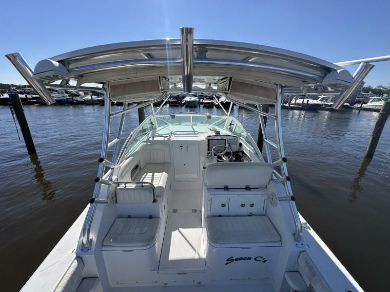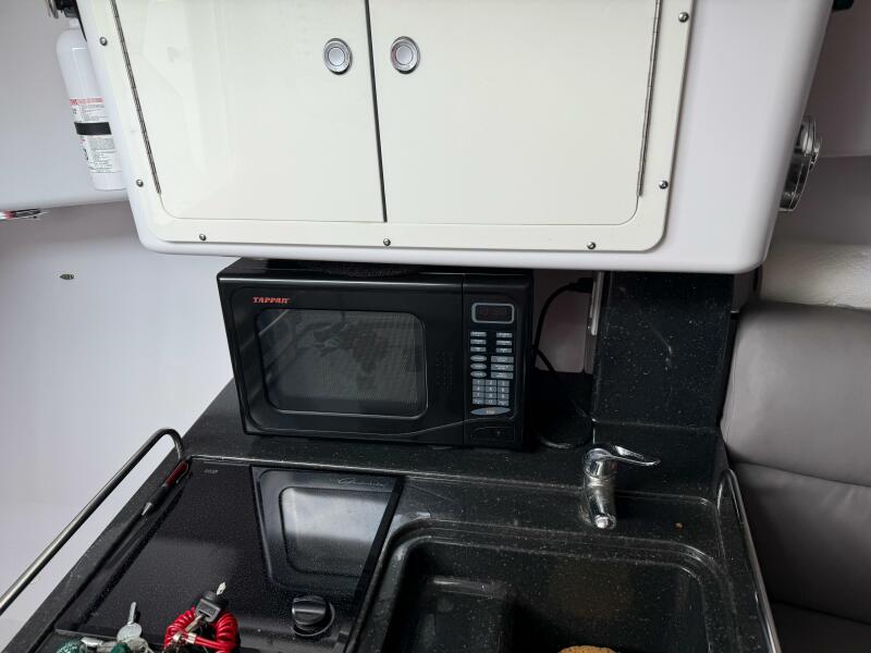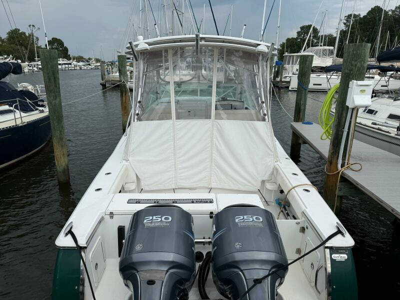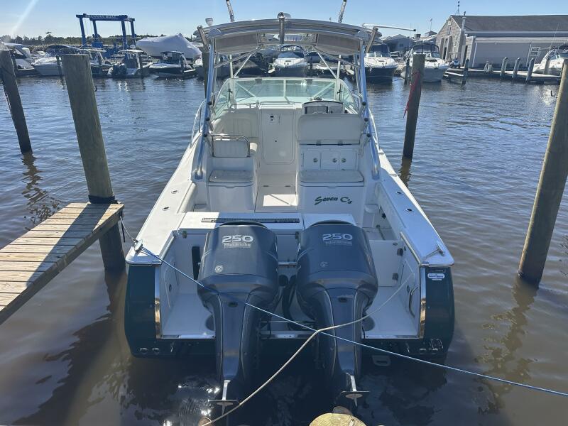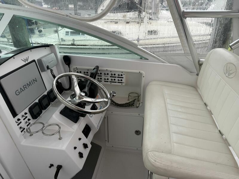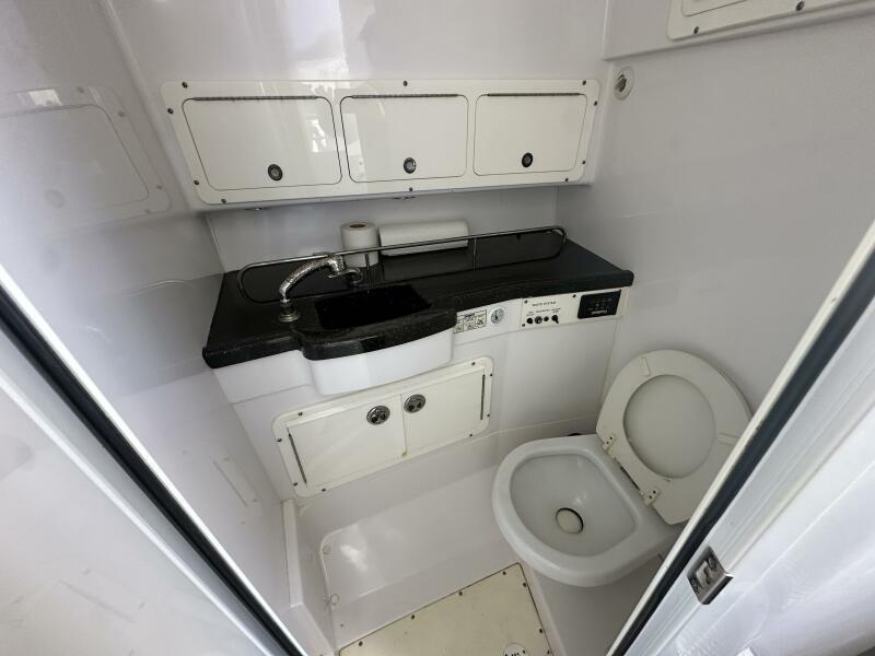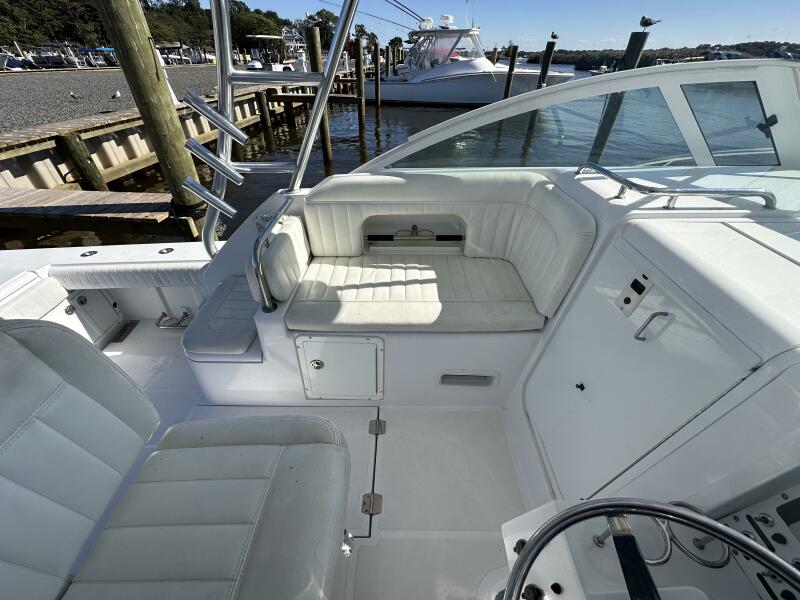 The helm area accommodates guests with seating to port, and aft-facing seats behind the helm. She boasts a 50 gallon stand-up livewell, a large insulated fish/storage box and plenty of tackle storage. There's a foldable bench seat at the transom to free up valuable cockpit space while fishing or accommodate additional guests while enjoying a day cruise. The downstairs cabin has all the basics— salon with dinette, V-berth forward and a full head w/ shower.