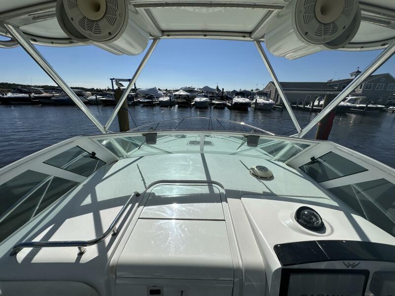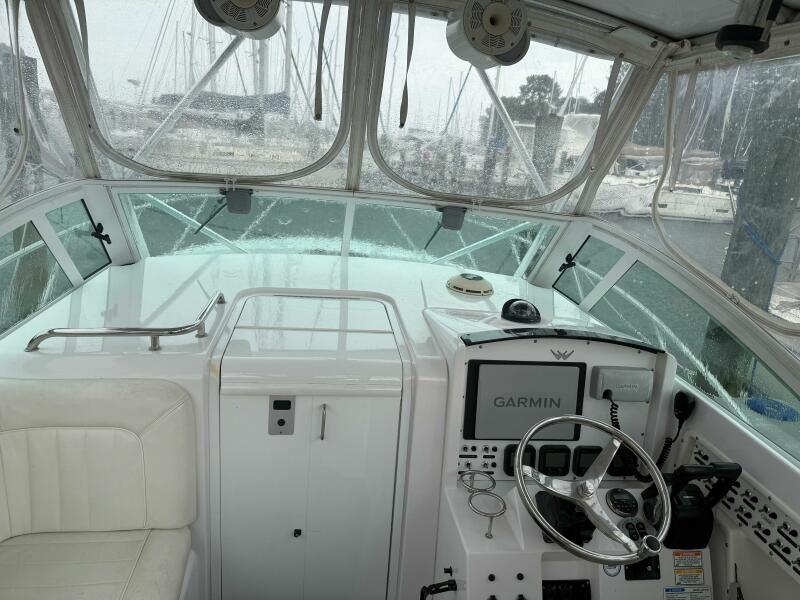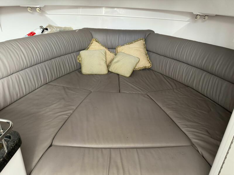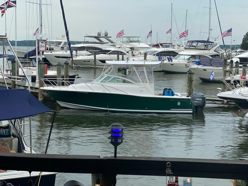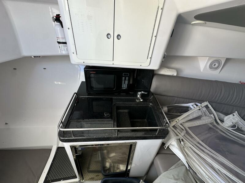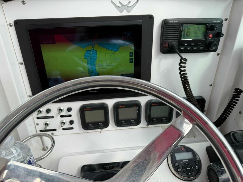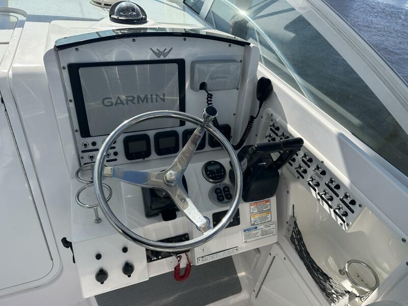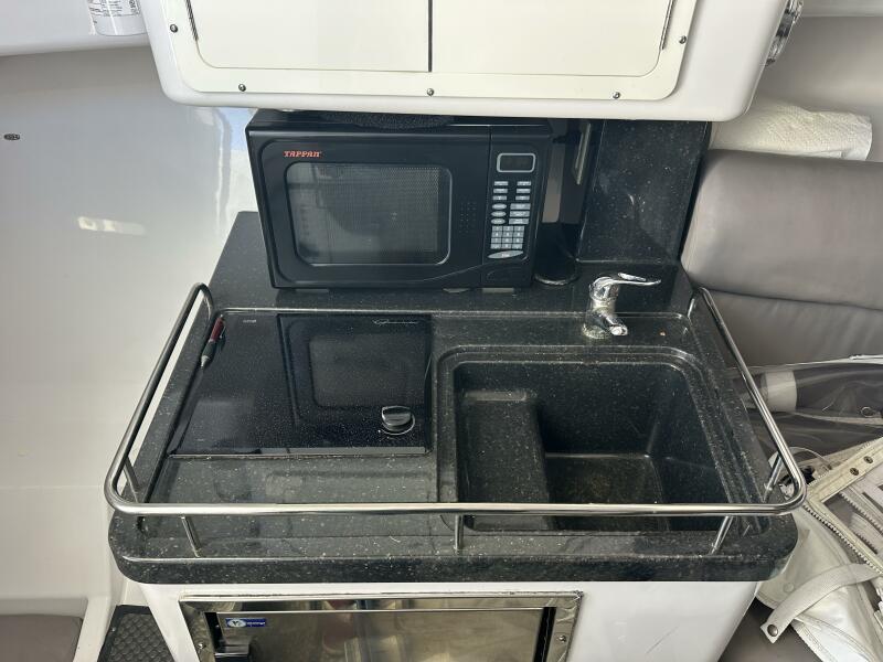 The helm area accommodates guests with seating to port, and aft-facing seats behind the helm. She boasts a 50 gallon stand-up livewell, a large insulated fish/storage box and plenty of tackle storage. There's a foldable bench seat at the transom to free up valuable cockpit space while fishing or accommodate additional guests while enjoying a day cruise. The downstairs cabin has all the basics— salon with dinette, V-berth forward and a full head w/ shower.