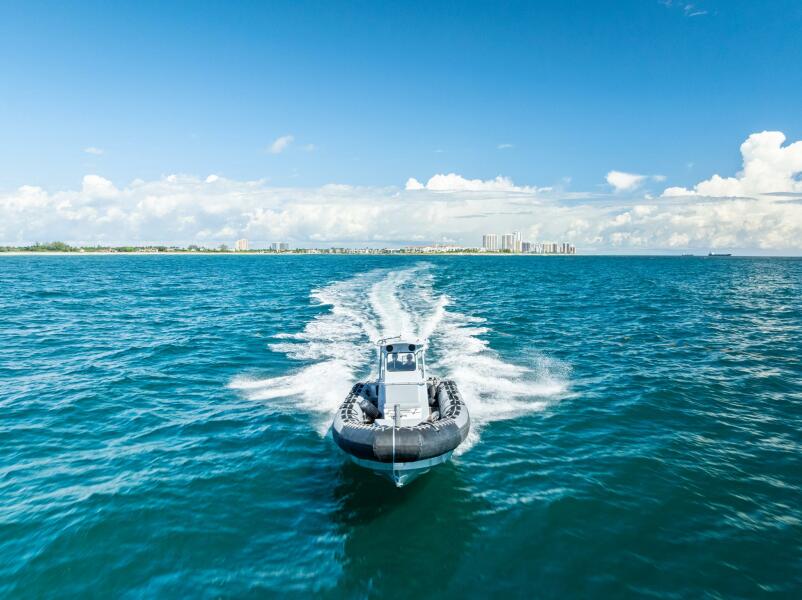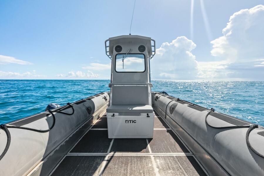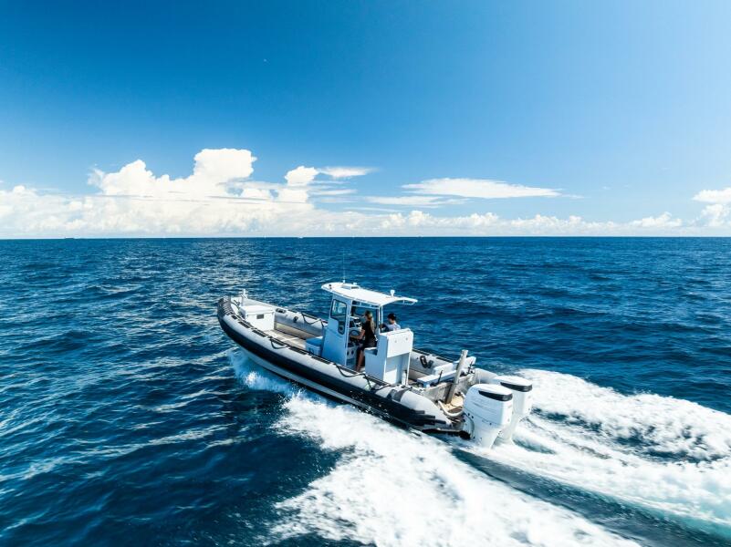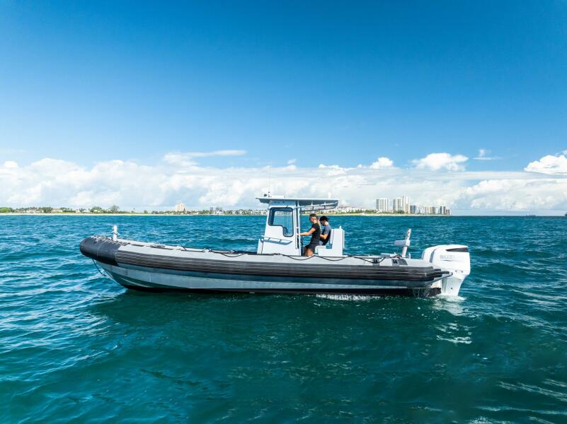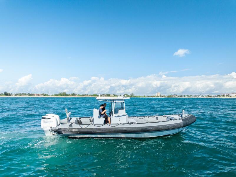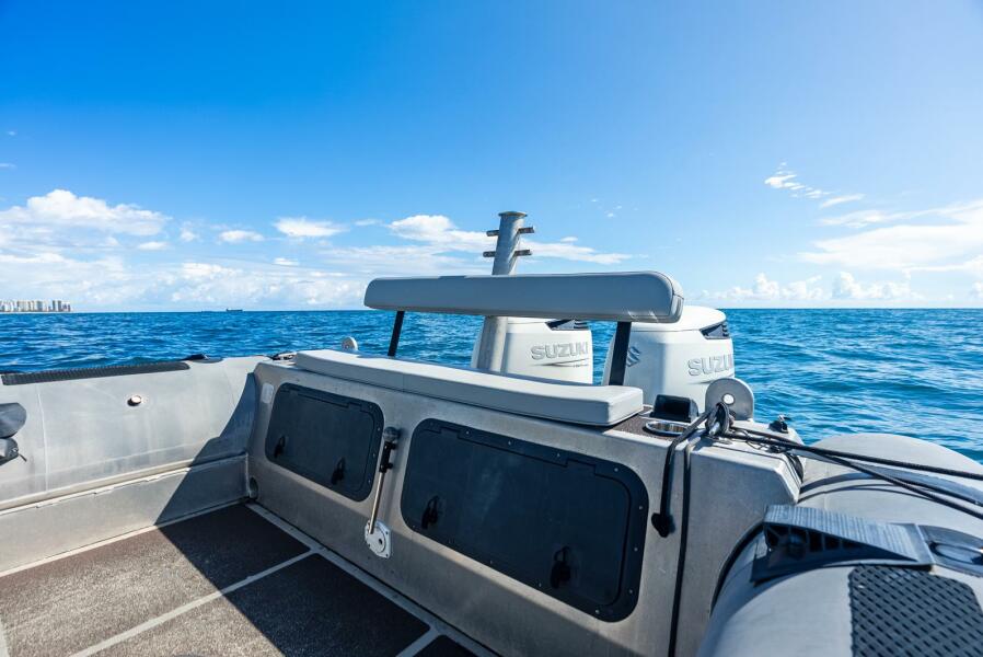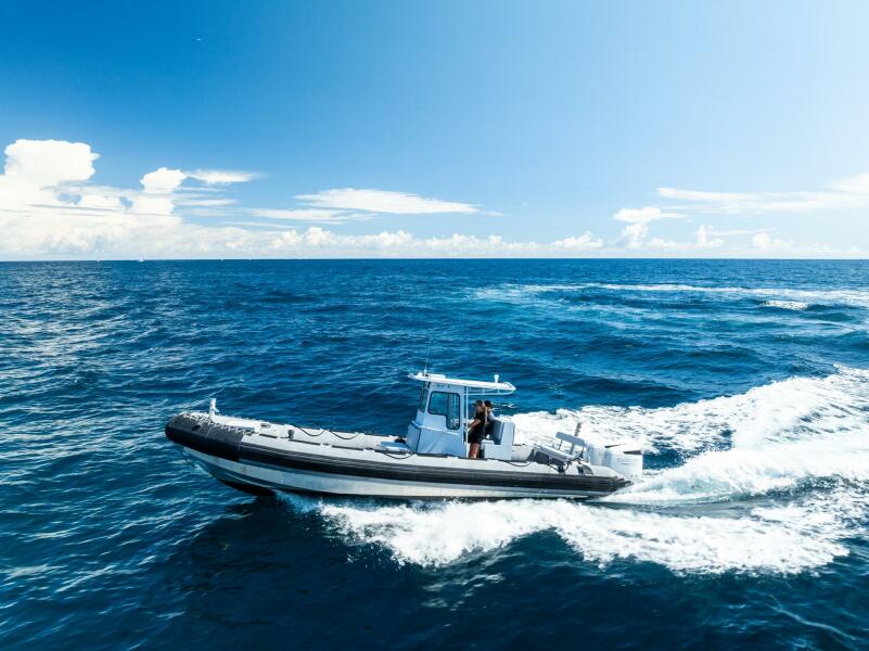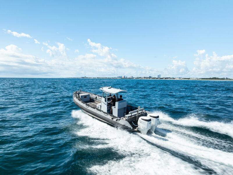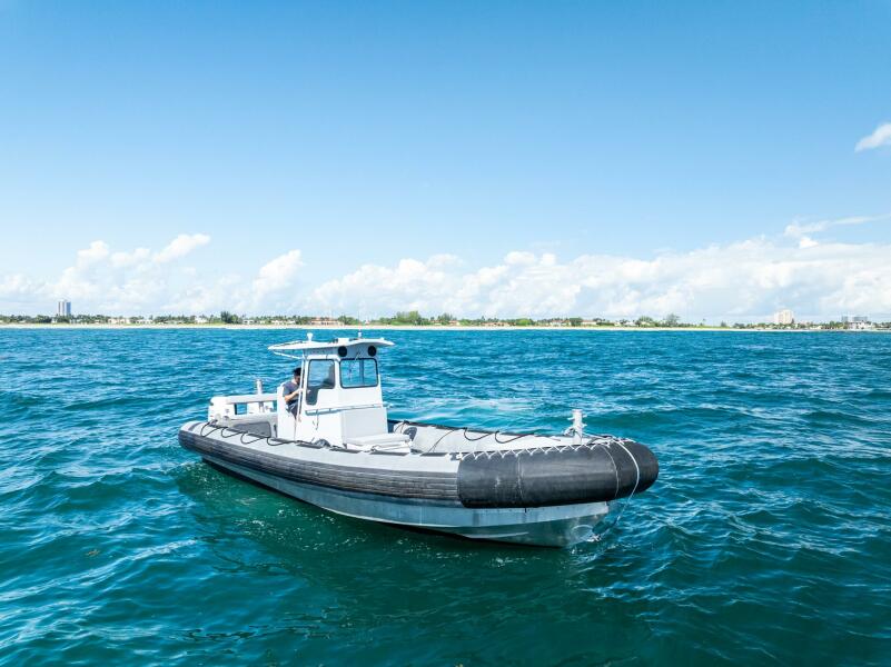 This rugged 31-foot Zodiac Hurricane 920 is built for performance and durability, featuring a welded deep-V aluminum hull paired with a large inflatable collar for superior stability and seaworthiness, even in rough conditions.