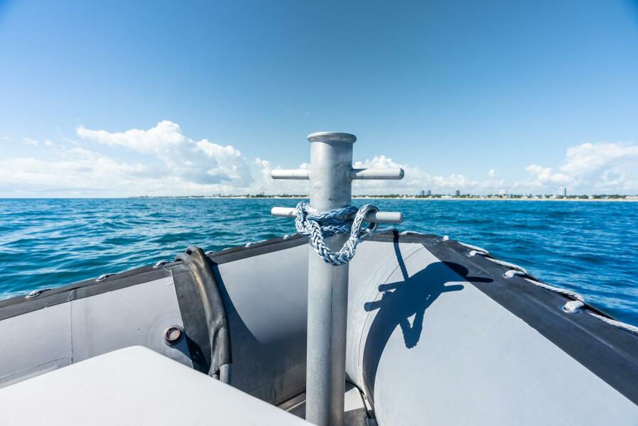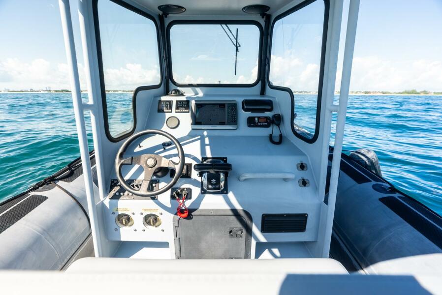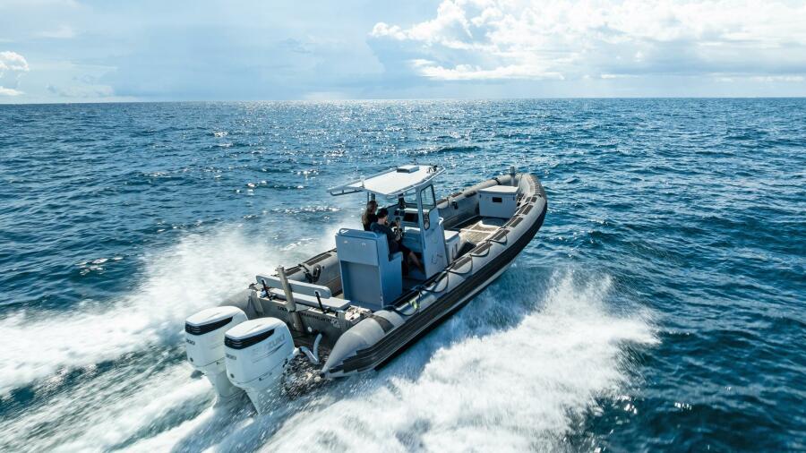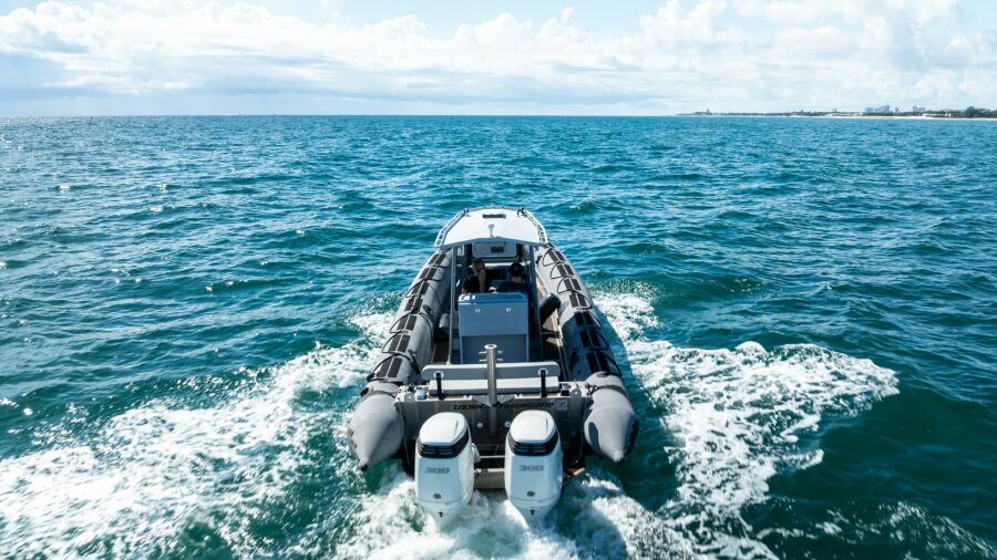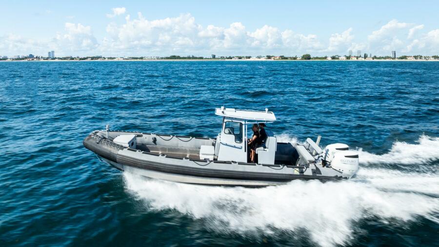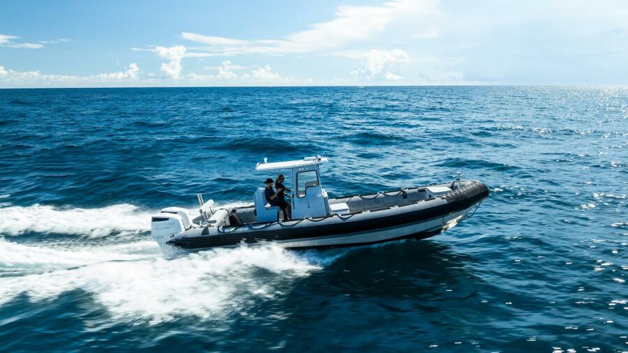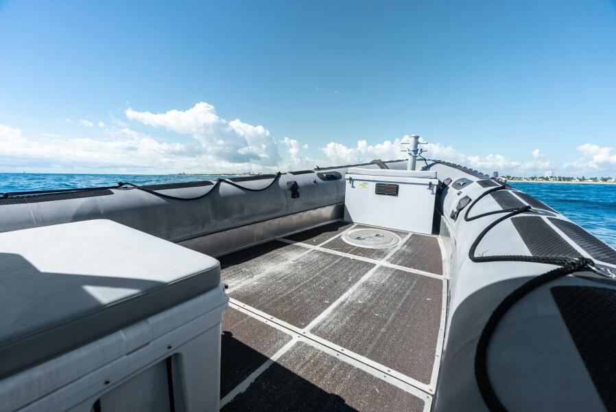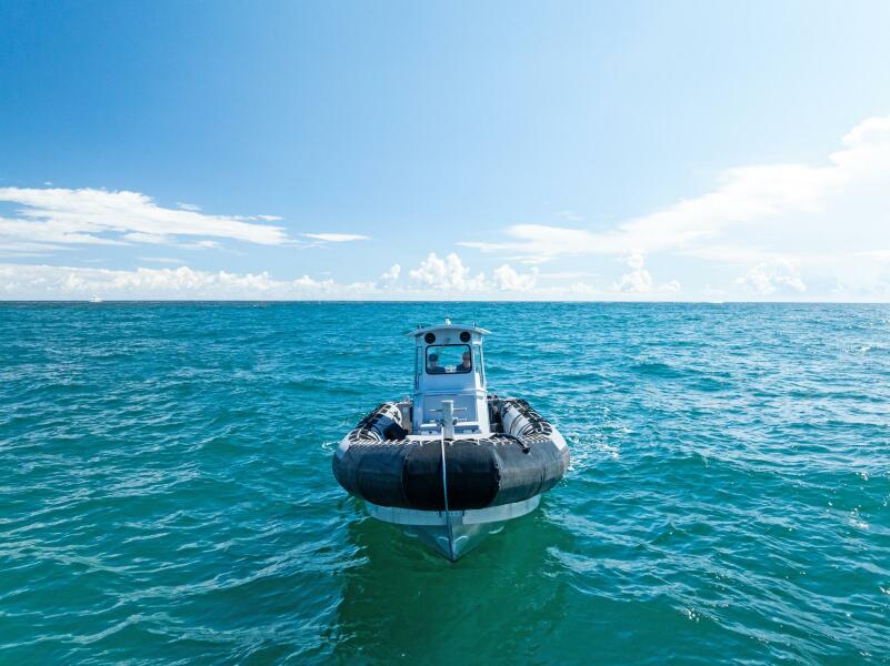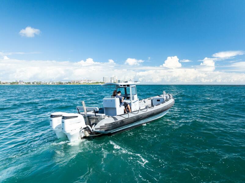 This rugged 31-foot Zodiac Hurricane 920 is built for performance and durability, featuring a welded deep-V aluminum hull paired with a large inflatable collar for superior stability and seaworthiness, even in rough conditions.