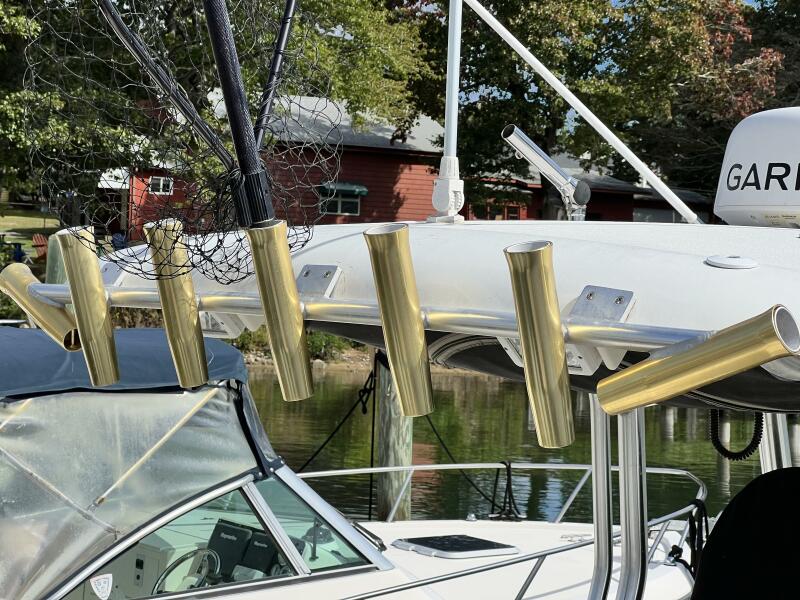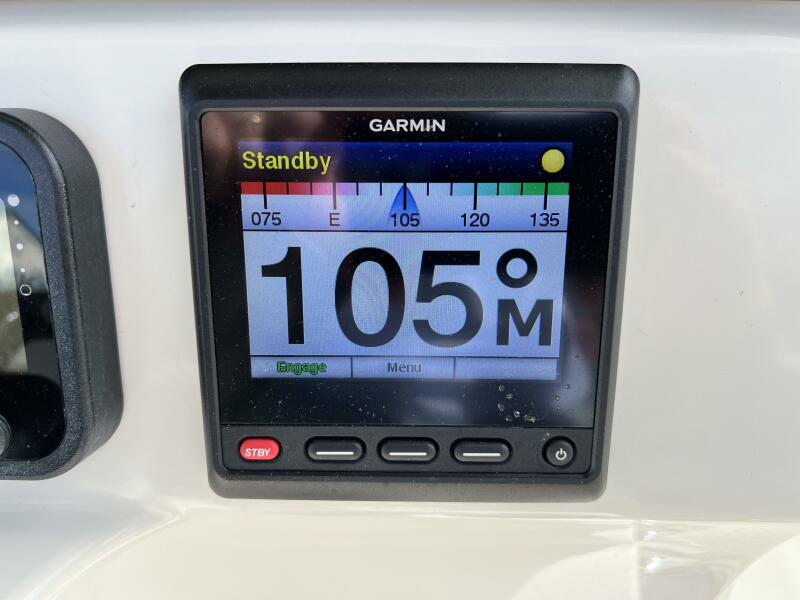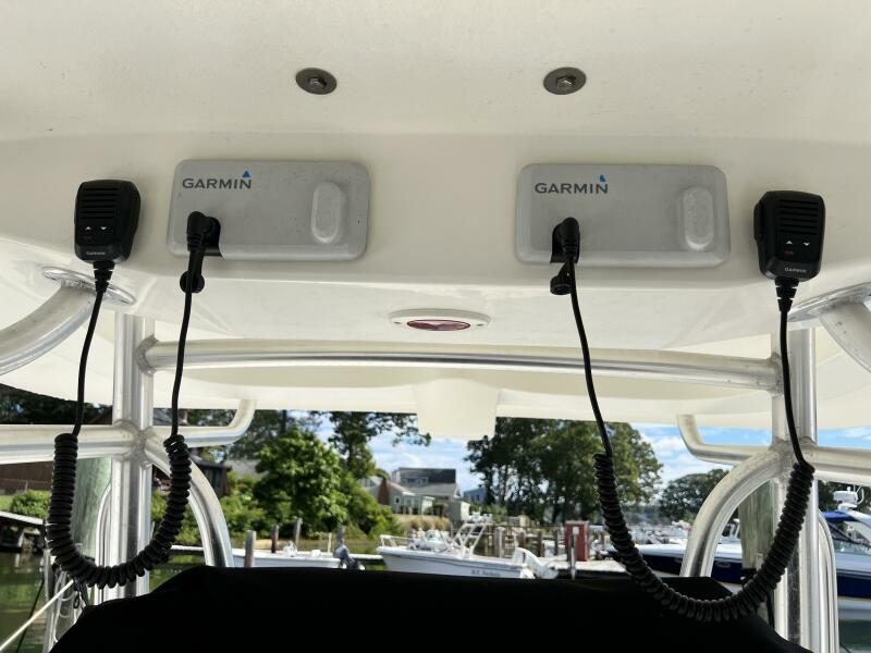 Her helm is outfitted with two impressive Garmin large-screen multifunction Displays—including Radar, GPS Chartplotter, Fishfinder/Sonar, Autopilot, and two VHF radios for full communication redundancy. The electric windlass with helm controls adds convenience at anchor, while the Load-Rite tandem axle trailer makes transport and storage a breeze. A custom winter cover is also included, underscoring how well this boat has been cared for.