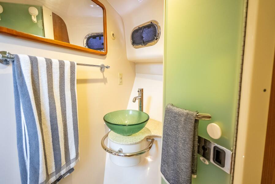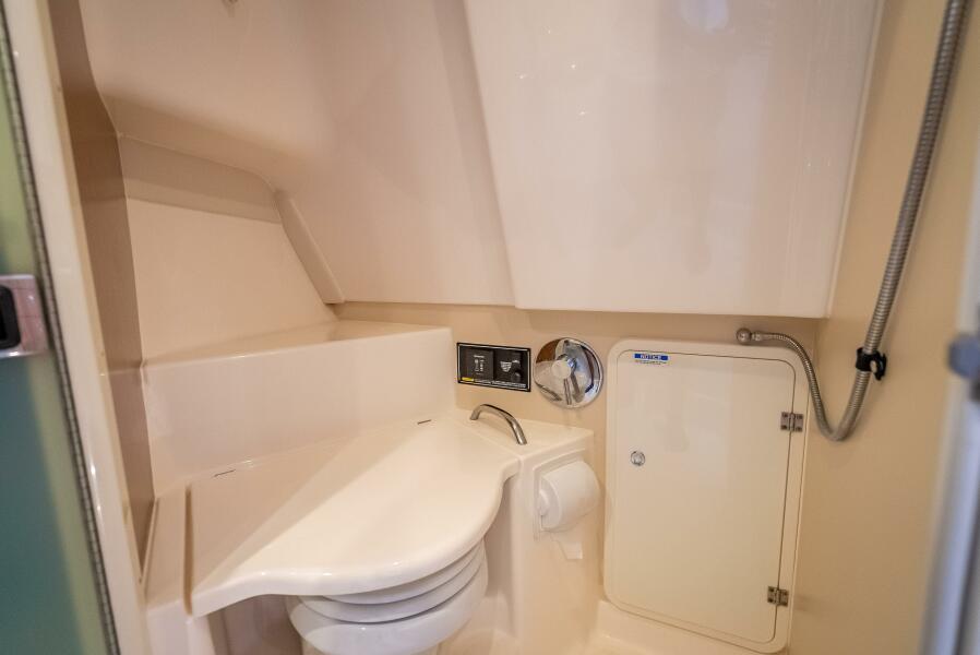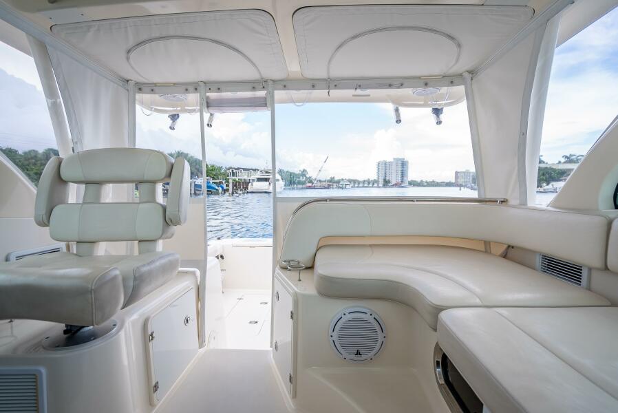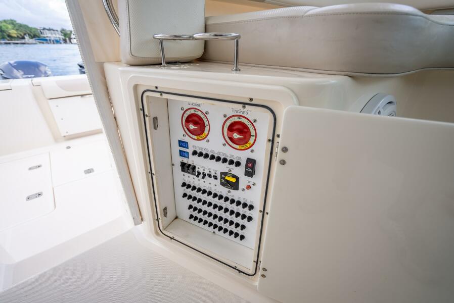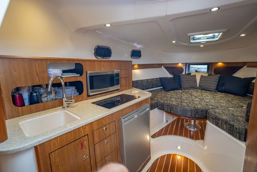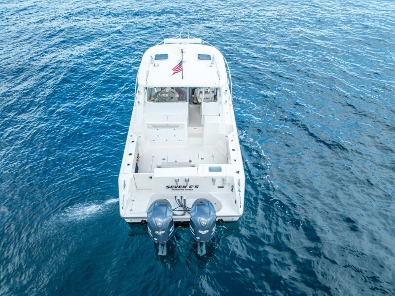 The large cockpit offers a fold-away aft seat, livewell, in-deck fish boxes, tackle storage, and plenty of room to work a crew. The helm features a clean, well-laid-out dash, helm air conditioning, and excellent visibility and protection from the elements. Down below, the air-conditioned cabin is bright and functional, with a compact galley, convertible dinette, enclosed head/shower, and mid-berth, making overnight trips easy and comfortable.
