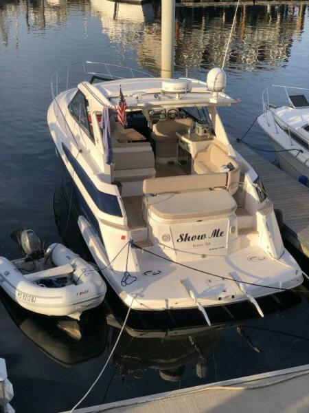 Welcome aboard 'Show Me', a 2011 Regal Sport Coupe powered by Volvo Penta D4-300 inboards with IPS drives and under 800 hours. Stunning color scheme with recently polished blue hull, beige cushion package, teak decks and white stamoid canvas enclosure.