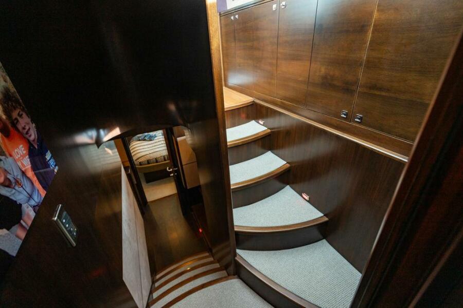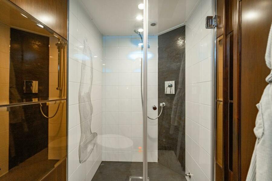 The two guest VIP staterooms are located aft, on port and starboard sides. Each stateroom is fitted with custom queen-sized beds, TV, air conditioning and ensuite heads. The heads feature large glass enclosed showers and Techma heads.