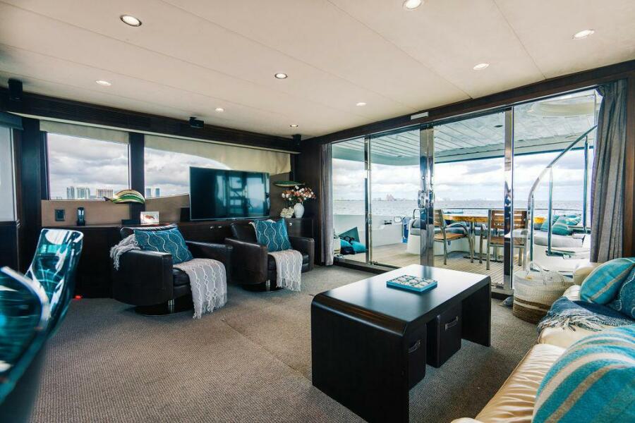 The full beam salon is open from the aft deck to the forward helm station, with large side windows and side deck doors allowing abundant natural light and fresh air. The salon area includes a large flat panel TV and entertainment center featuring a Bose surround sound system throughout the entire boat. The spacious salon has two leather upholstered chairs to starboard and an L-shaped leather couch to port.