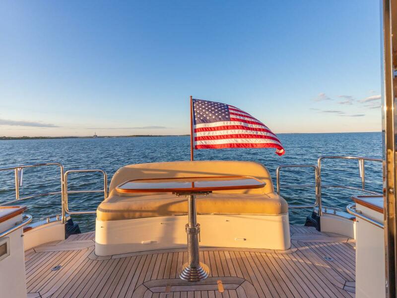 Additional innovative features include: pantry with laundry and wine bottle storage accessed behind the stairs; five electric opening windows and an enormous electric moonroof in the salon; electric up/down double companion settee with convertible backrest across from helm; aft deck refrigeration; wide swim platform with super yacht steps leading up each side and three joystick docking stations – all making for a uniquely comfortable and functional owner-operated yacht.