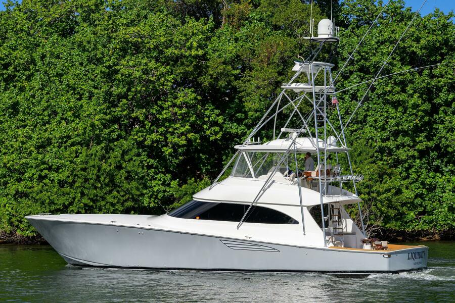 The 2015 62' Viking Convertible "Liquidity" has been maintained with an open checkbook since new, with all engine work expertly handled by Smith and Wick Marine. Her upgraded CAT C32A 1,925 hp engines have received continuous, proactive service, including the comprehensive 1,000-hour service intervals as required. Built for elite performance and stability, she features a Kingston Gray painted hull, full teak package, Seakeeper 26, and Omni sonar. The vessel is fully optimized for long-range travel and fishing with twin generators, extra fuel, an Eskimo ice machine, and a watermaker. Her professional-grade outfitting is completed by AME electronics and a custom Palm Beach Towers tuna tower.