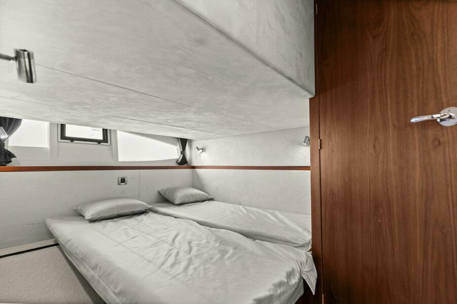 A pair of single berths mounted to the deck athwartships. Each berth is 6’4” (1.93 m) long and 2’6” (76.2 cm) wide, with 1’2” (35.6 cm) between them when separated completely. Each is mounted to a track that can slide the berths together to create one large berth -- the best such system for this kind of setup we’ve yet seen. The berths have 2’7” (78.7 cm) of headroom above them, and the bulkheads and overhead are upholstered in Alcantara suede.
