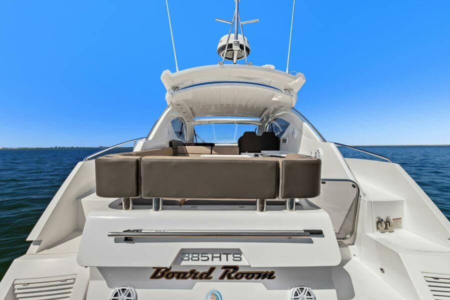 The 385 HTS is quite literally maxed out with amazing use of space and the depth of consideration in adding luxury grace notes at every turn. The Alcantara suede lining the inside of closets, the backlit vanity elegantly squeezed into a bulkhead in the master stateroom, the artful inlay of the lowerdeck salon dining table.