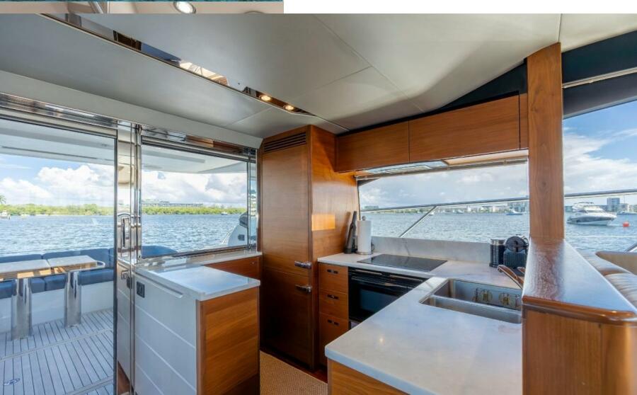 Princess craftsmanship is immediately evident in the S65’s bright, beautifully finished interior. The aft-galley layout creates seamless indoor/outdoor flow — ideal for entertaining. Large salon windows fill the space with natural light, while the electric sunroof brings open-air yachting into the salon at the touch of a button.
