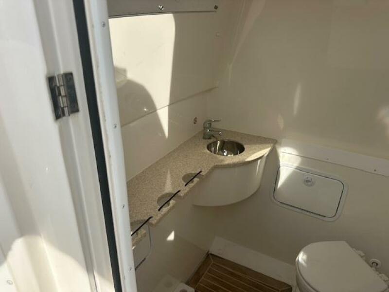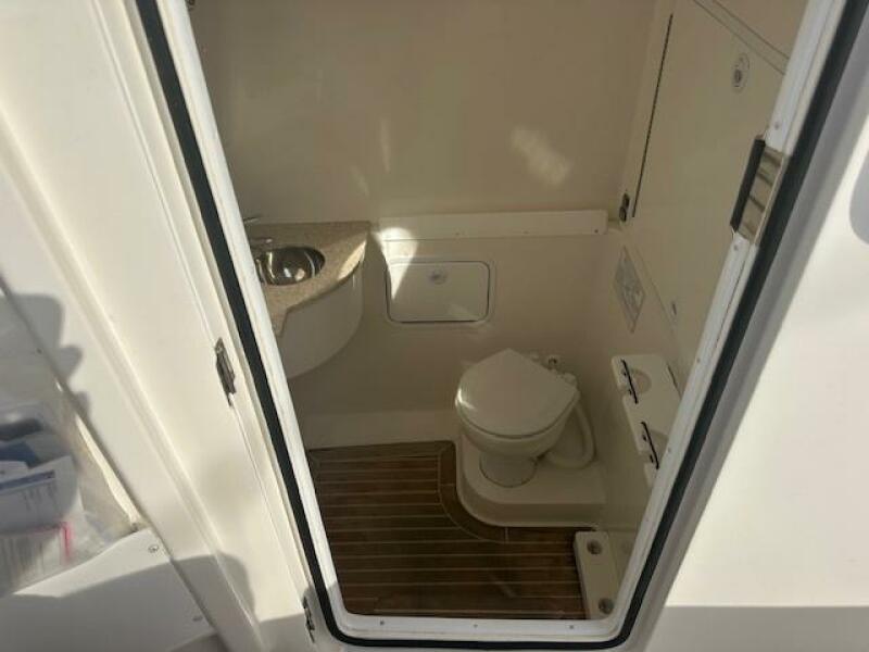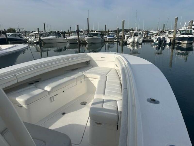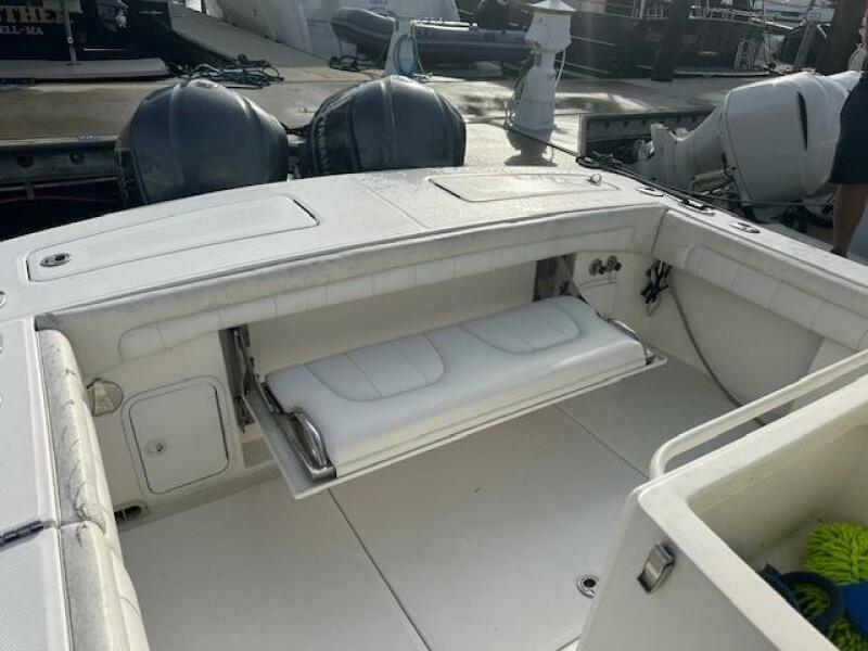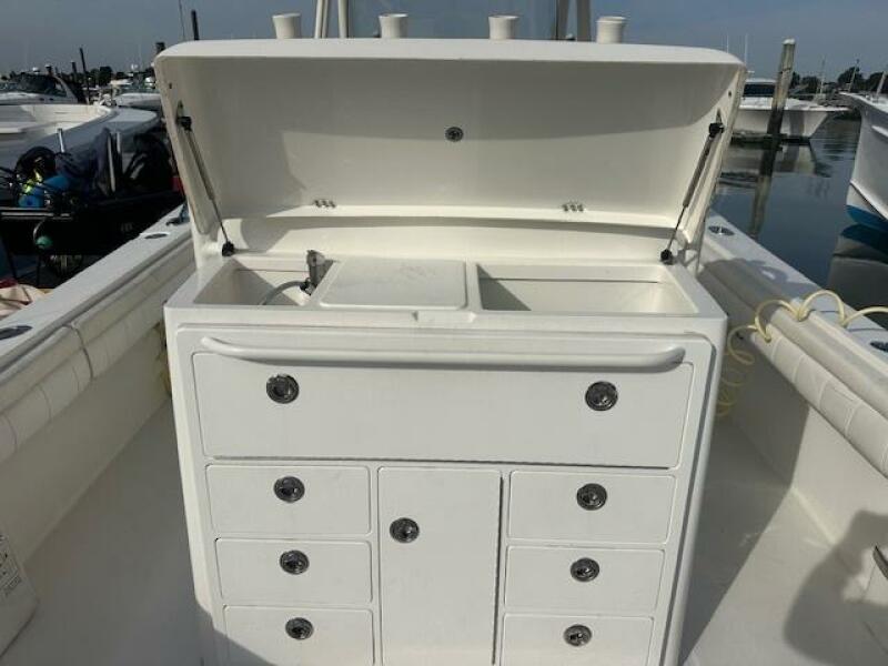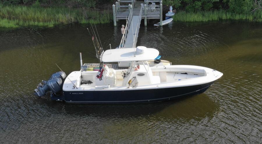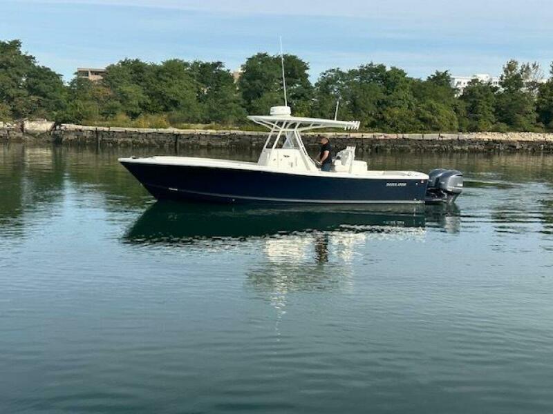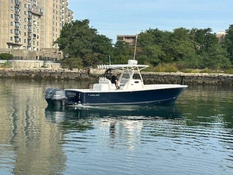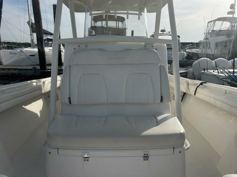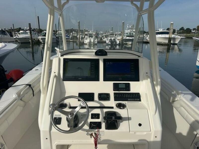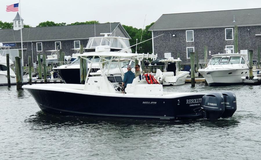 RESOLUTE, is a great example of a well equipped 31 Regulator FS, featuring the Flag Blue Hull, full Garmin Package, Powder Coat Package, Cockpit Engine Flush, Sun Bed Table, New Forward Cushions, and more.