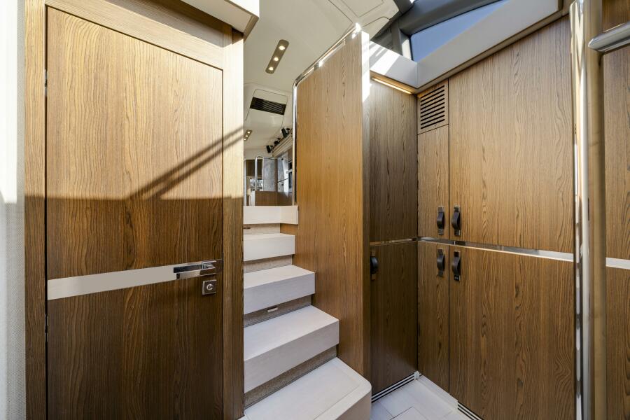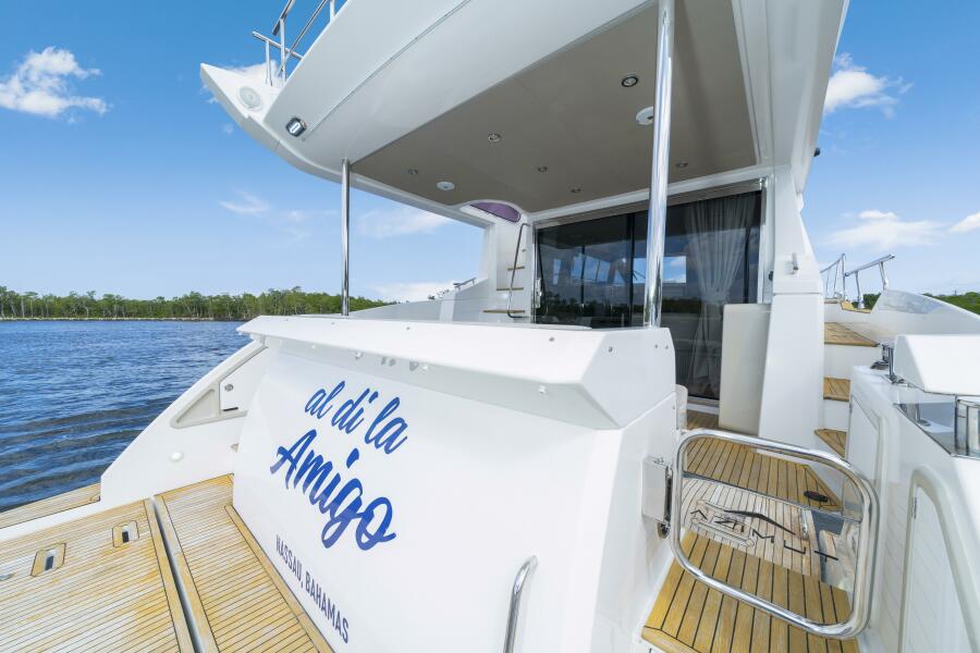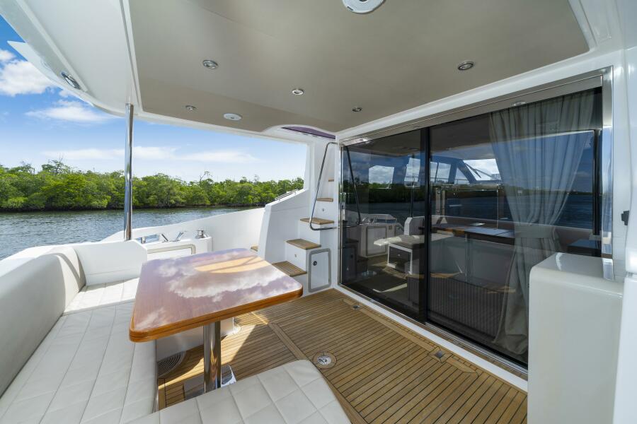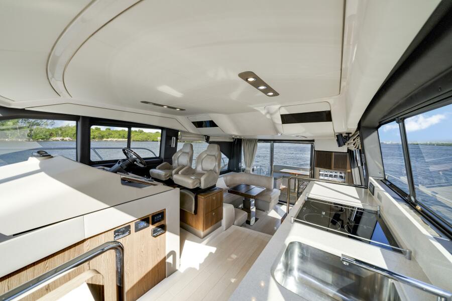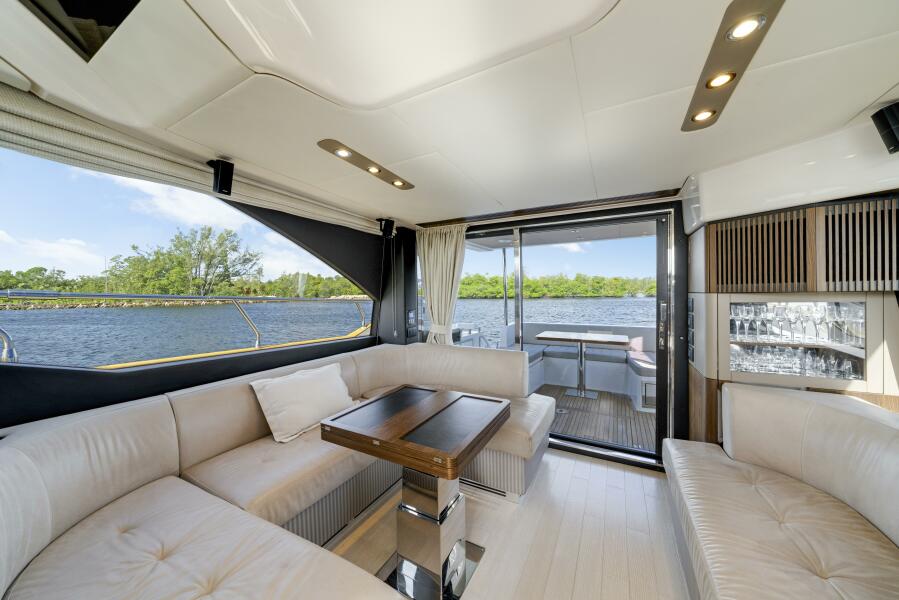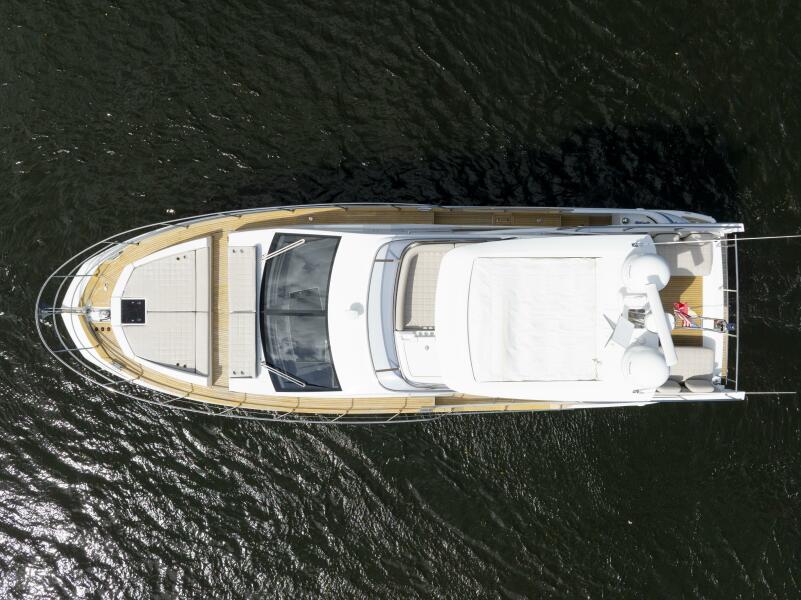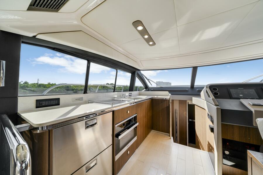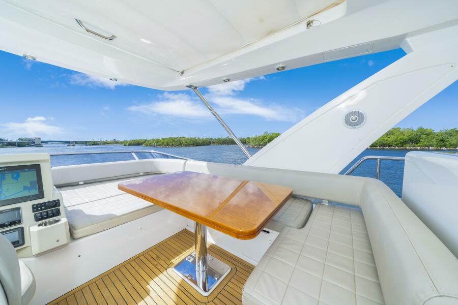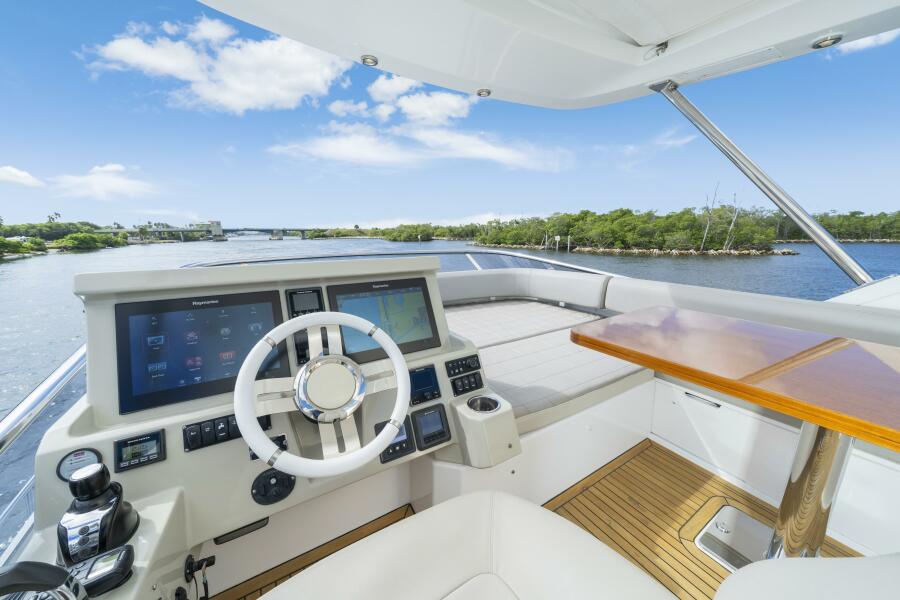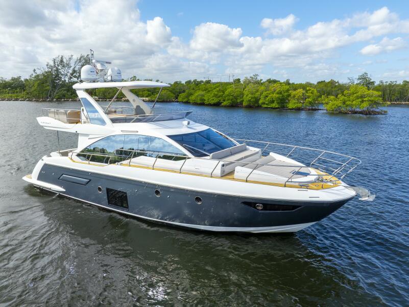 The 2018 Azimut 50 Flybridge is a luxury motor yacht known for its spacious and elegant Italian design, and a large flybridge for its class. It offers a combination of comfort, performance, and advanced features for cruising and entertaining, including an exceptionally large flybridge for its size class, with a hardtop that includes a retractable sunroof. On the flybridge, it has a fully equipped helm station with dual Raymarine screens, a wet bar with a refrigerator and electric BBQ, a lounge area, and sun pads.