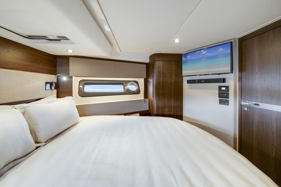 A three stateroom and two head layout includes a full-beam master suite is located midship, featuring a large island bed, oversized windows, and an en-suite bathroom.