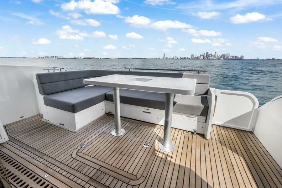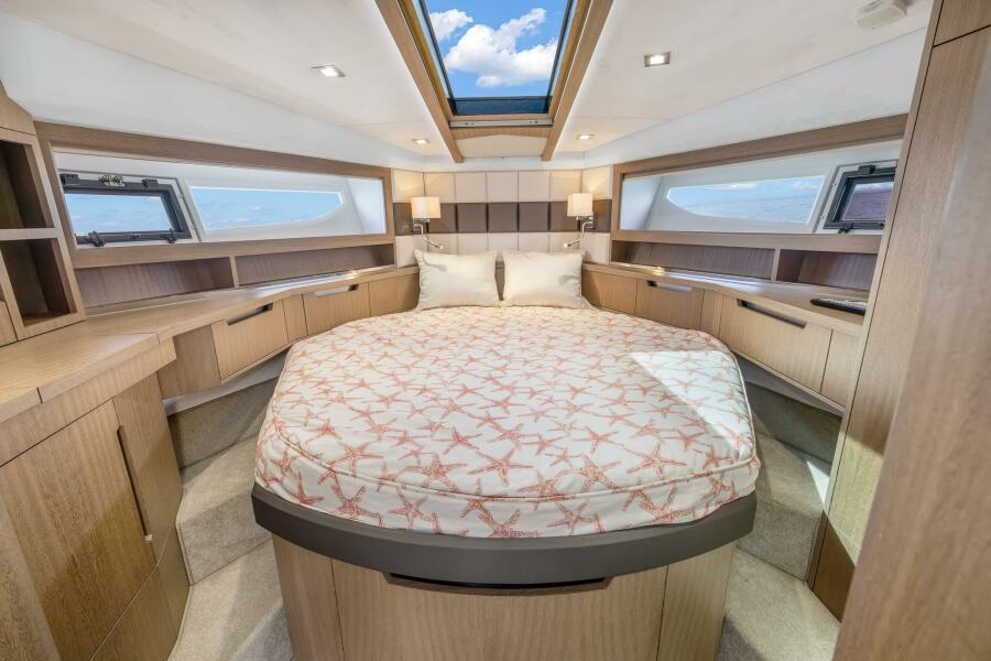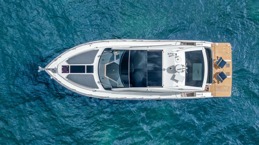 The Galeon 43 HTC offers the sleek exterior lines of a hardtop express without compromising interior volume. Inside, her salon impresses with high ceilings and abundant natural light flowing directly into an atrium-style galley down complimented with a two-stateroom layout, below deck. Her outdoor spaces are equally well thought out as well. The aft deck features a clever sliding seat module that extends aft to open up the cockpit for entertaining, while the hydraulic swim platform can either serve as a teak beach for water access, and/or store your personal watercraft of choice.