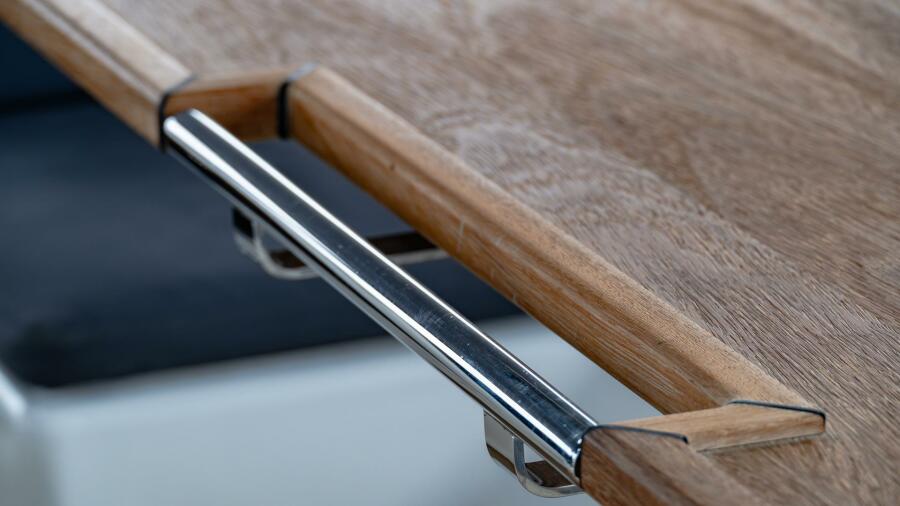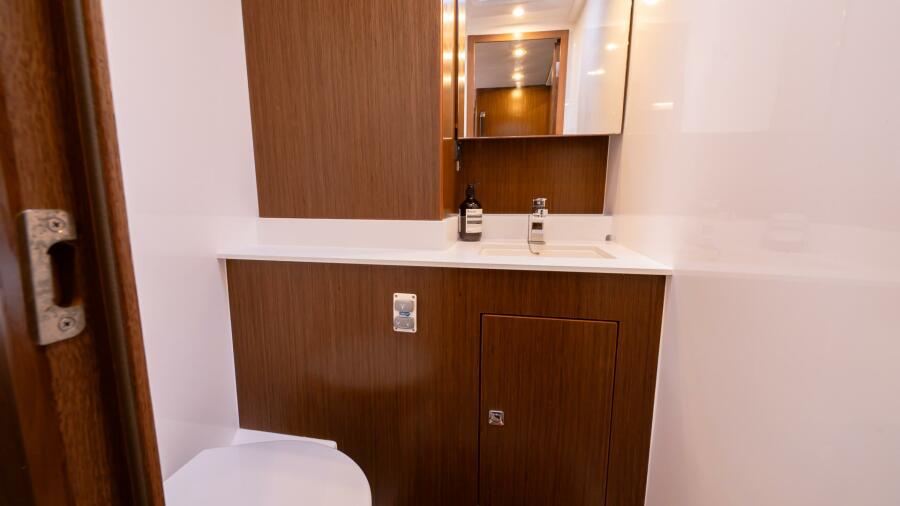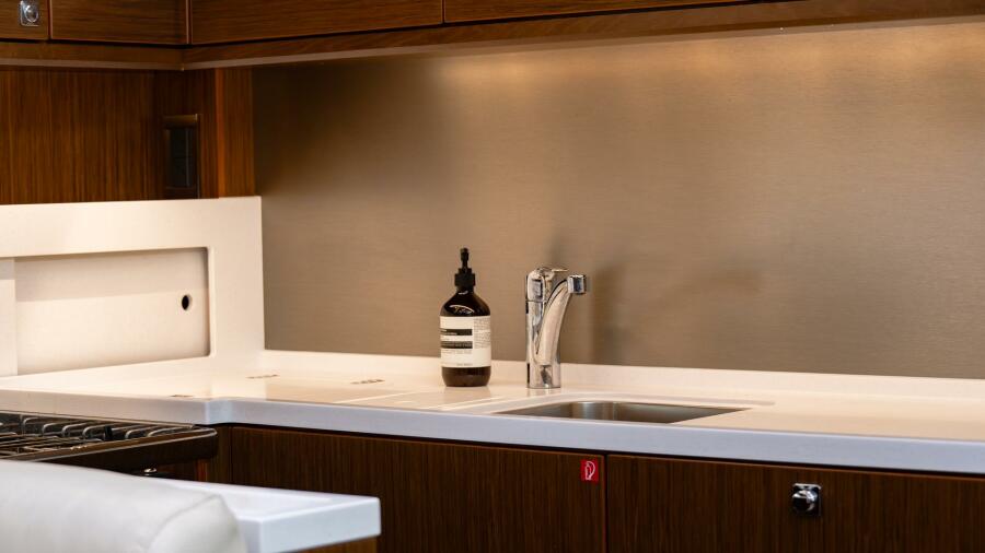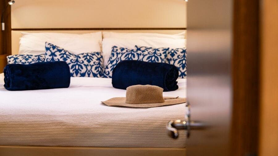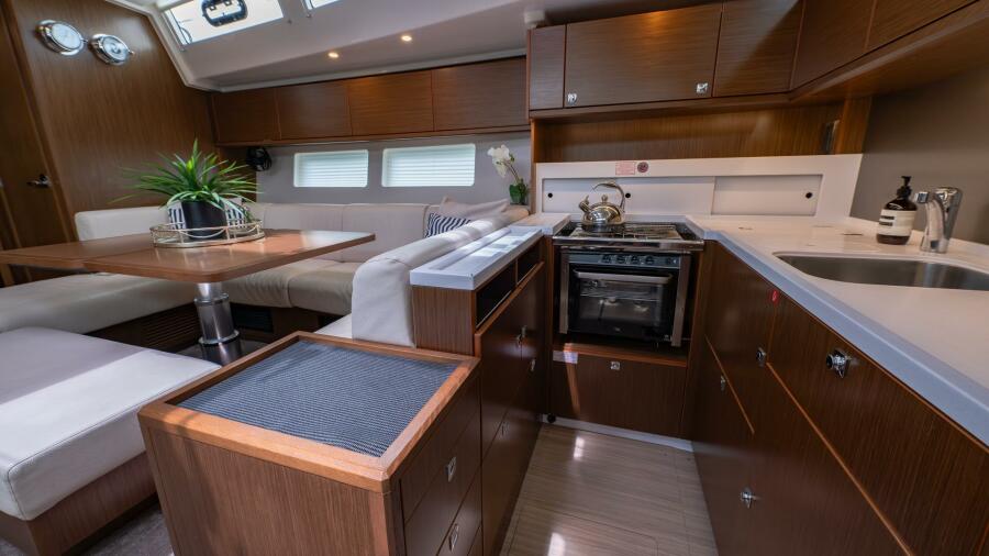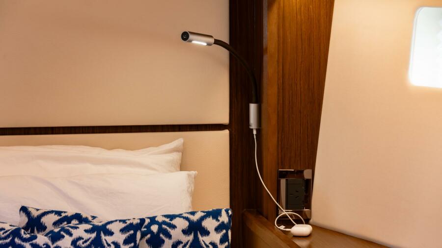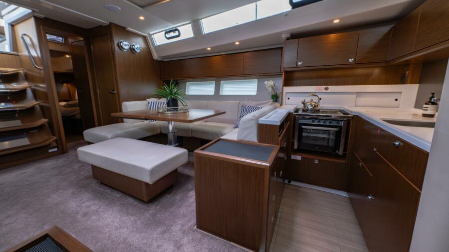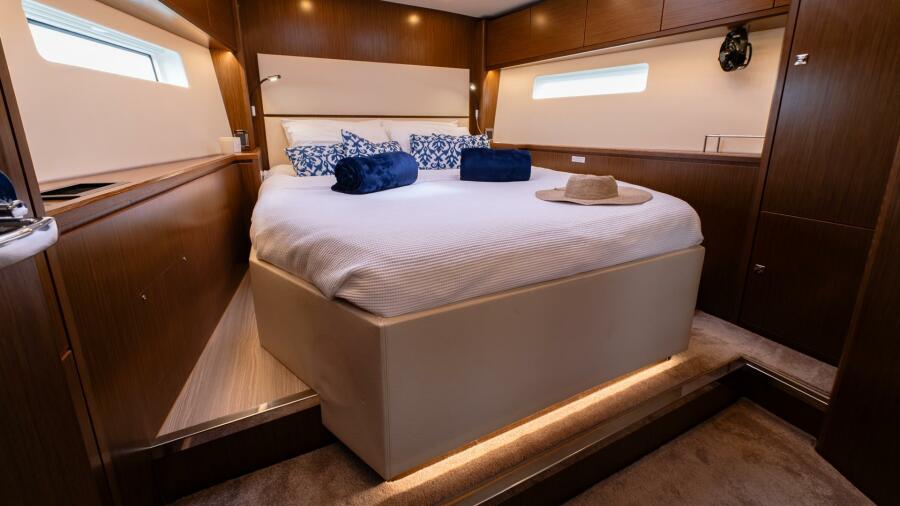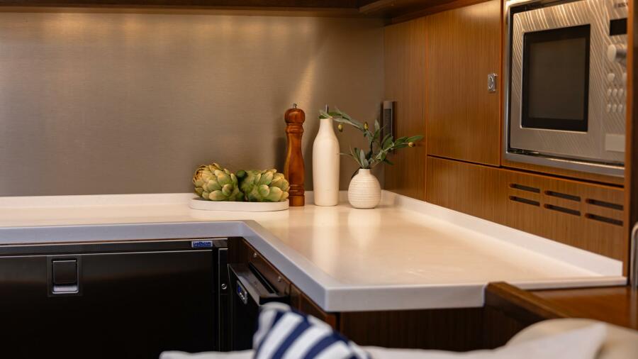 Below deck, Nixie features an open-plan saloon with abundant natural light and ceiling heights up to 2.4 metres. The full-beam galley sits just forward of midships, providing ample bench space and storage. The owners’ suite is spacious with a walk-around queen bed, plentiful light and a separate ensuite shower and head.