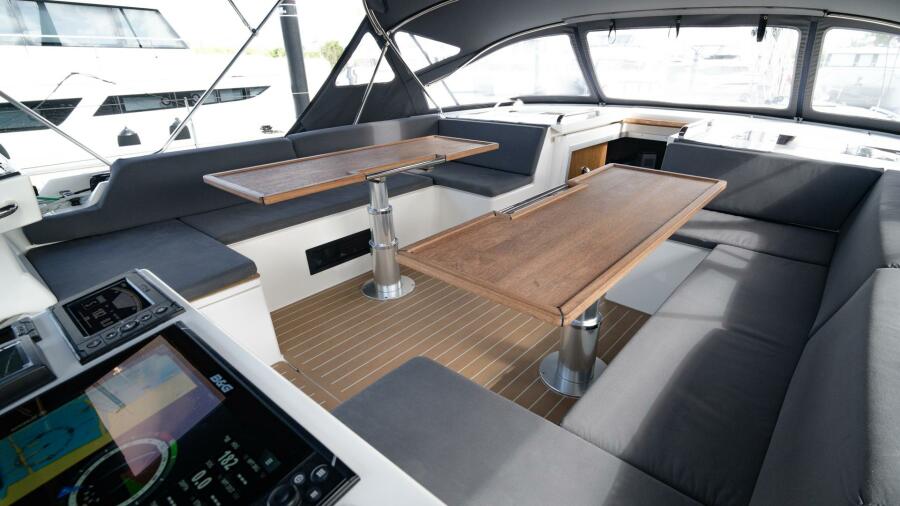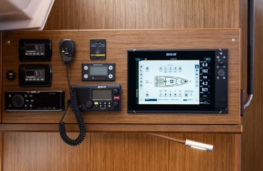 Aft of the galley, the dining area includes an electrically adjustable table that transforms from dining height to a coffee table, complemented by a 42-inch smart TV opposite a two-person starboard sofa. The navigation station and chart table are located just aft with comprehensive B&G instrumentation.