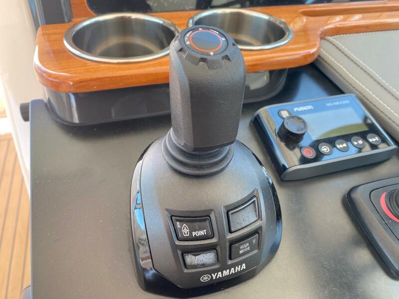 Located at the helm: Yamaha Joystick, Fusion Apollo Stereo, Lenco trim, Push button controls, Dometic AC controls for helm and companion seat, FLIR control panel, Engine ignition, engine throttle controls, Lewmar bow thruster control stick and compass.