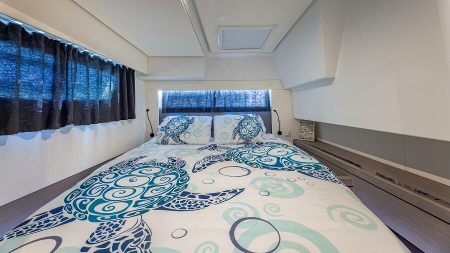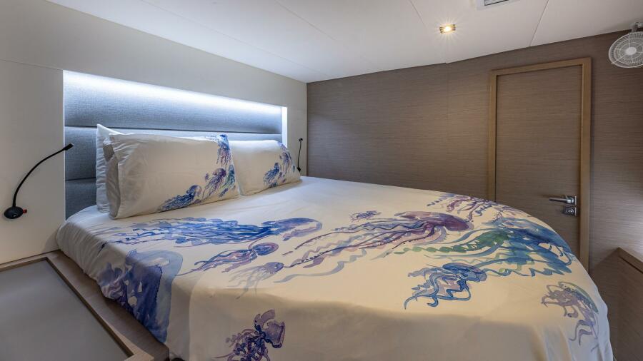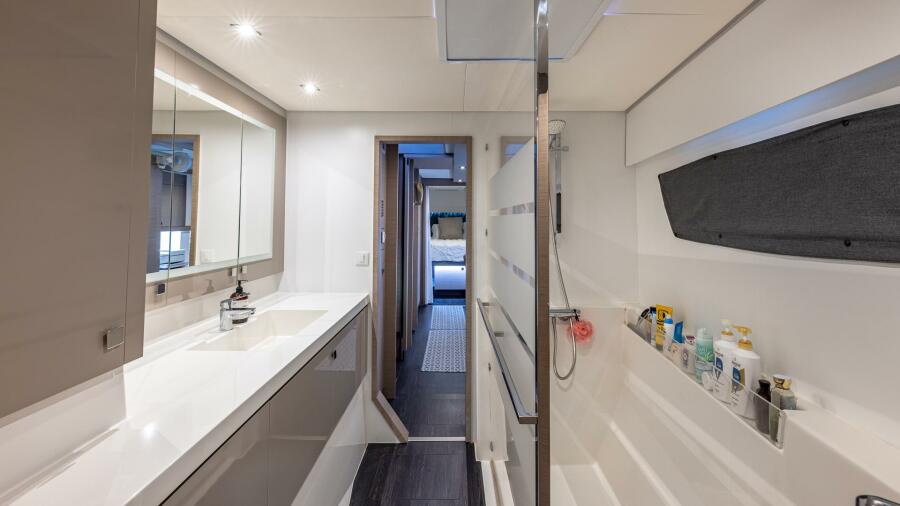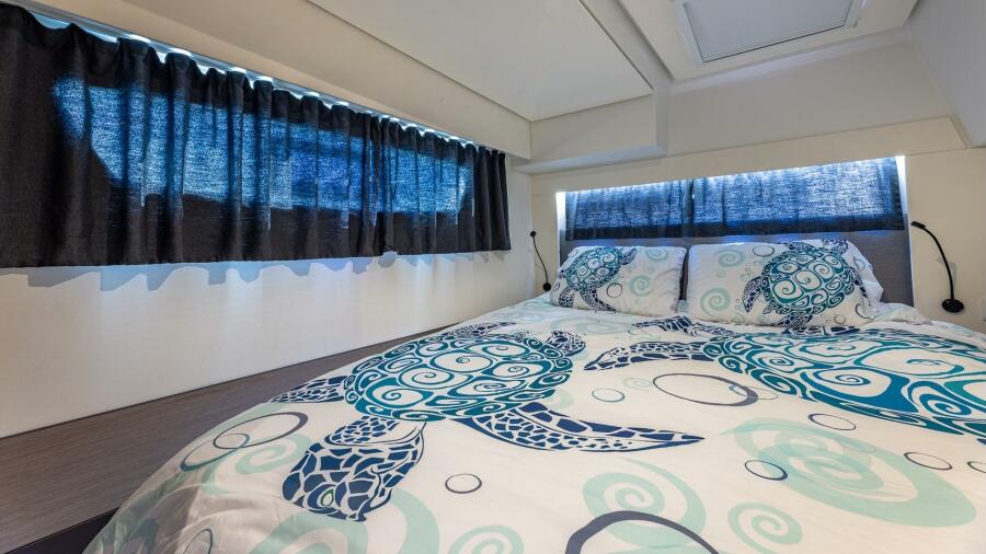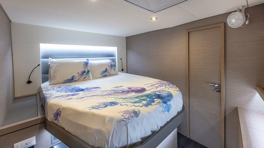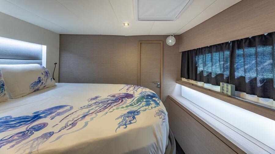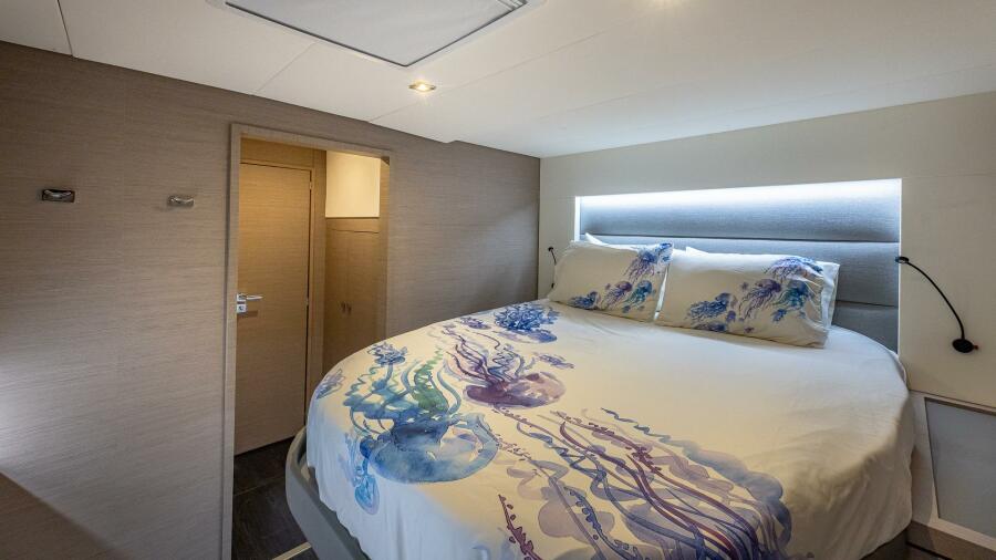 • Owner stateroom takes entire port hull with blackout curtains, custom cabinetry, walk-in shower, and upgraded Casper Memory mattress