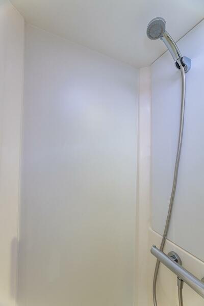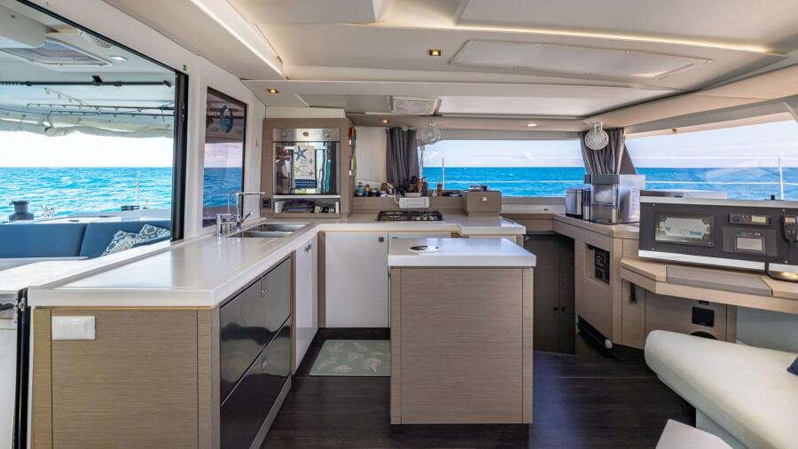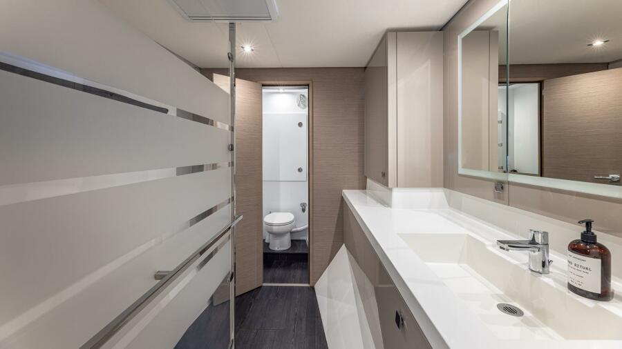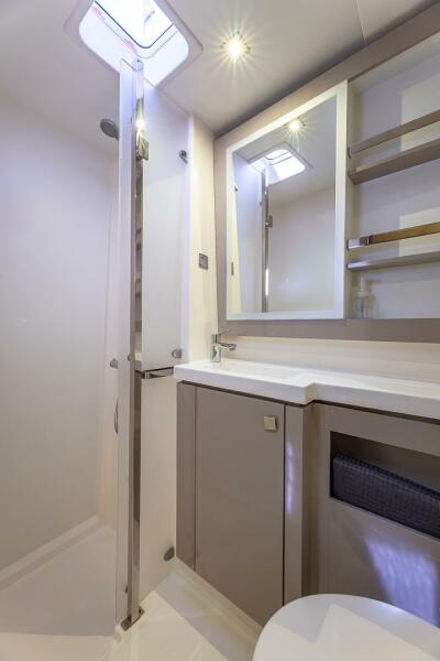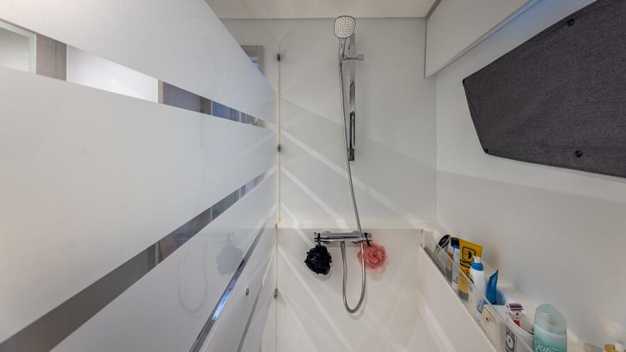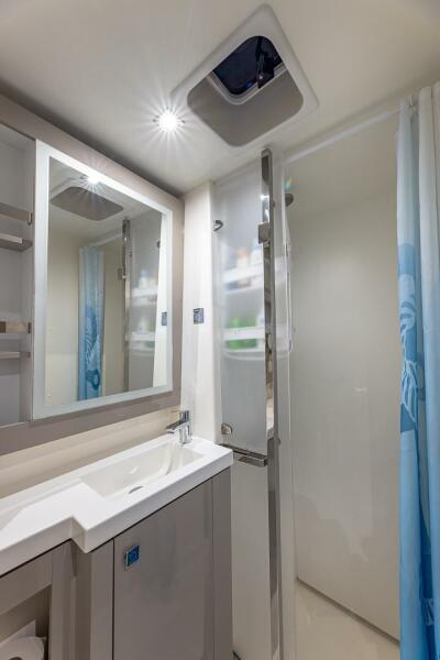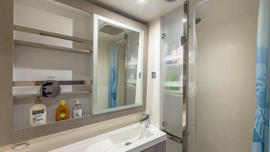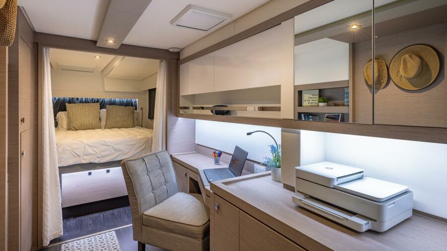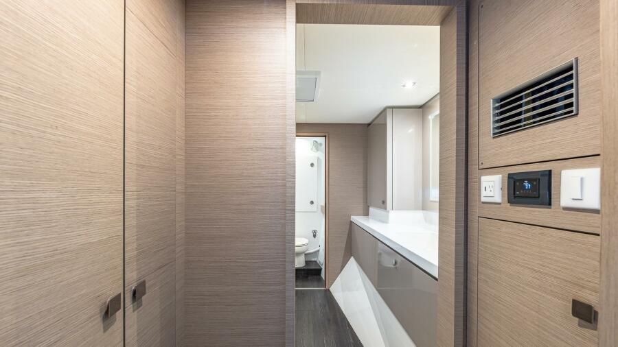 • Owner stateroom takes entire port hull with blackout curtains, custom cabinetry, walk-in shower, and upgraded Casper Memory mattress